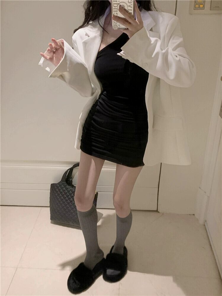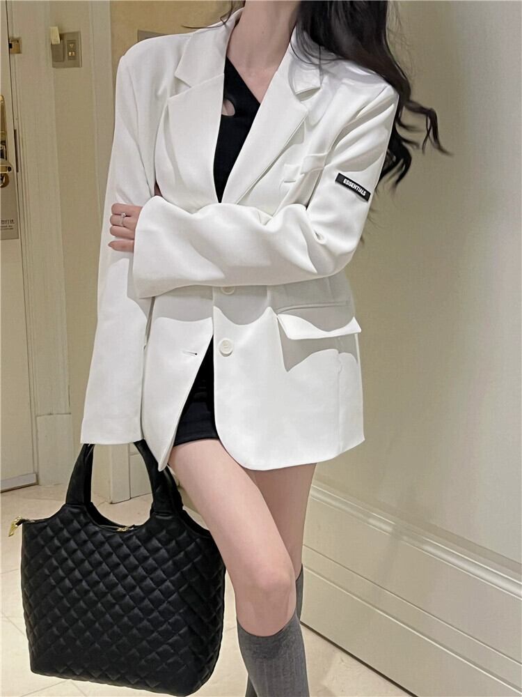 2023年秋の有能な白い肩パッド入りスーツジャケットの女性の新しい気質ミッドレングスのゆったりとしたスリムなスーツ ホワイト オータム 秋物 0921931100319474