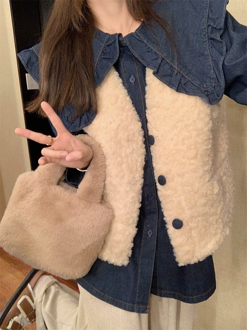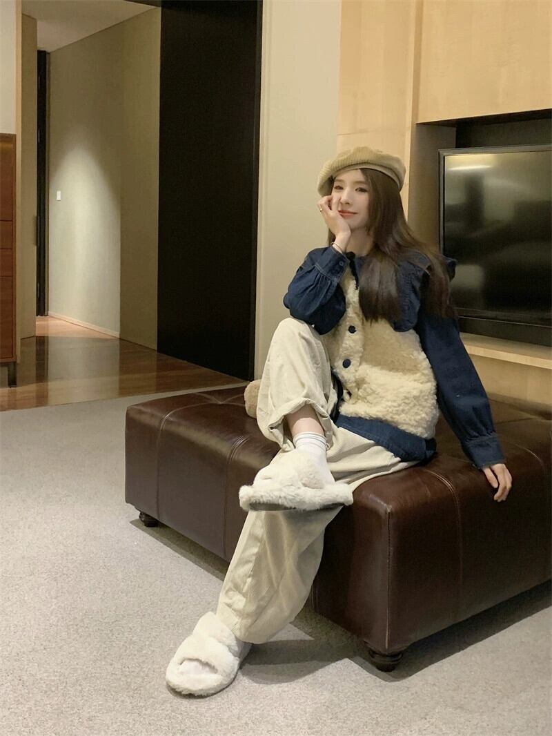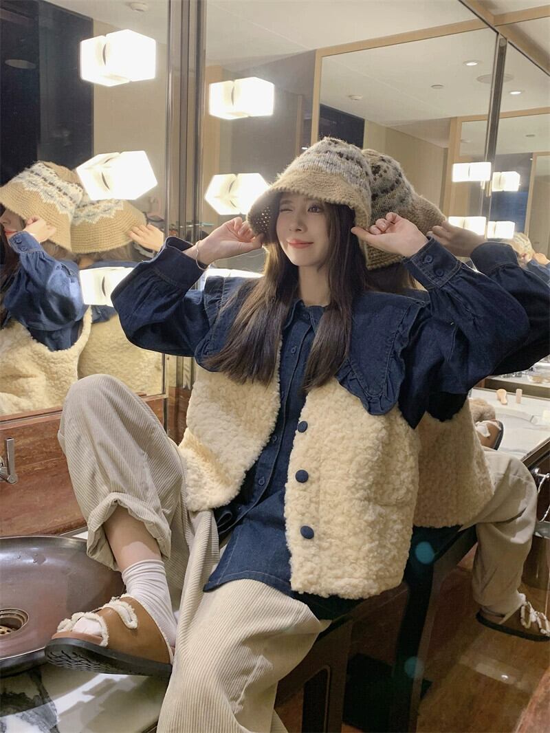 多用途ツーピース女性の 2023 秋の新しい模造ラムウールベスト人形襟デニムシャツセット オータム 秋物 0921925818925756