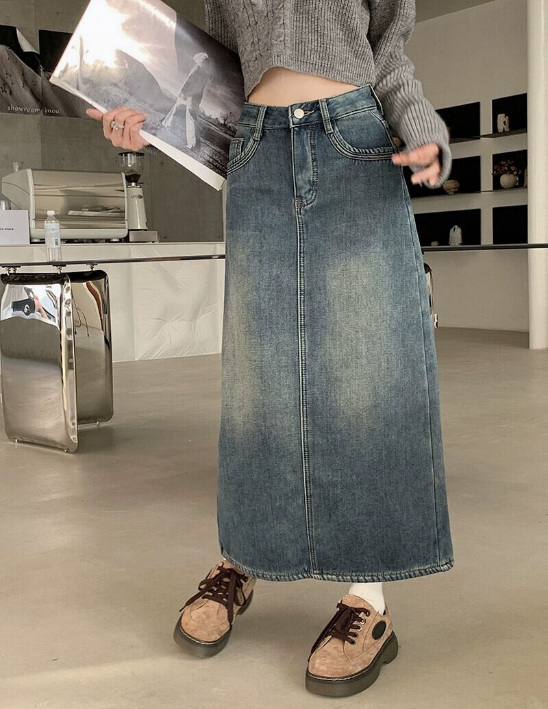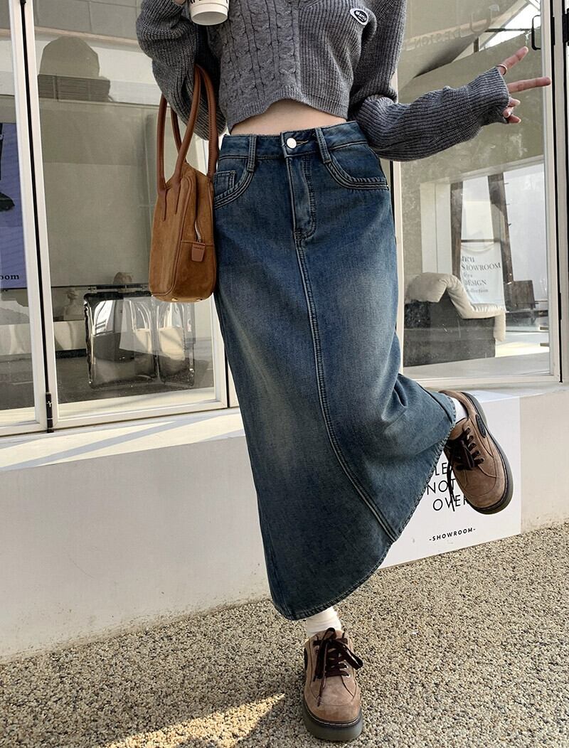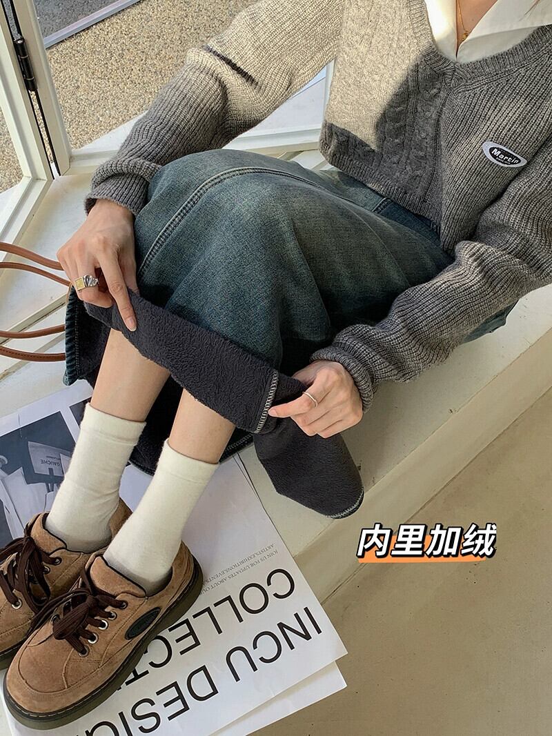 レトロベルベット肥厚スリットデニムスカート女性秋 2023 新しいハイウエストスリムミッドレングス A ラインスカート オータム 秋物 Aライン 0921940116319302