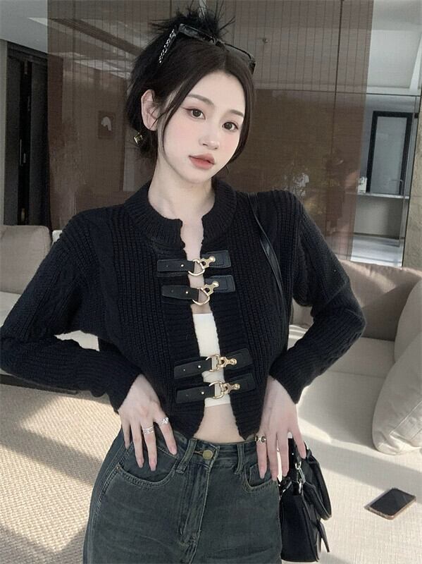 アメリカンニッチメタルボタンセーターカーディガンレディース秋デザイン中空ショート長袖ニットトップ ロング オータム 秋物 0921914145852042