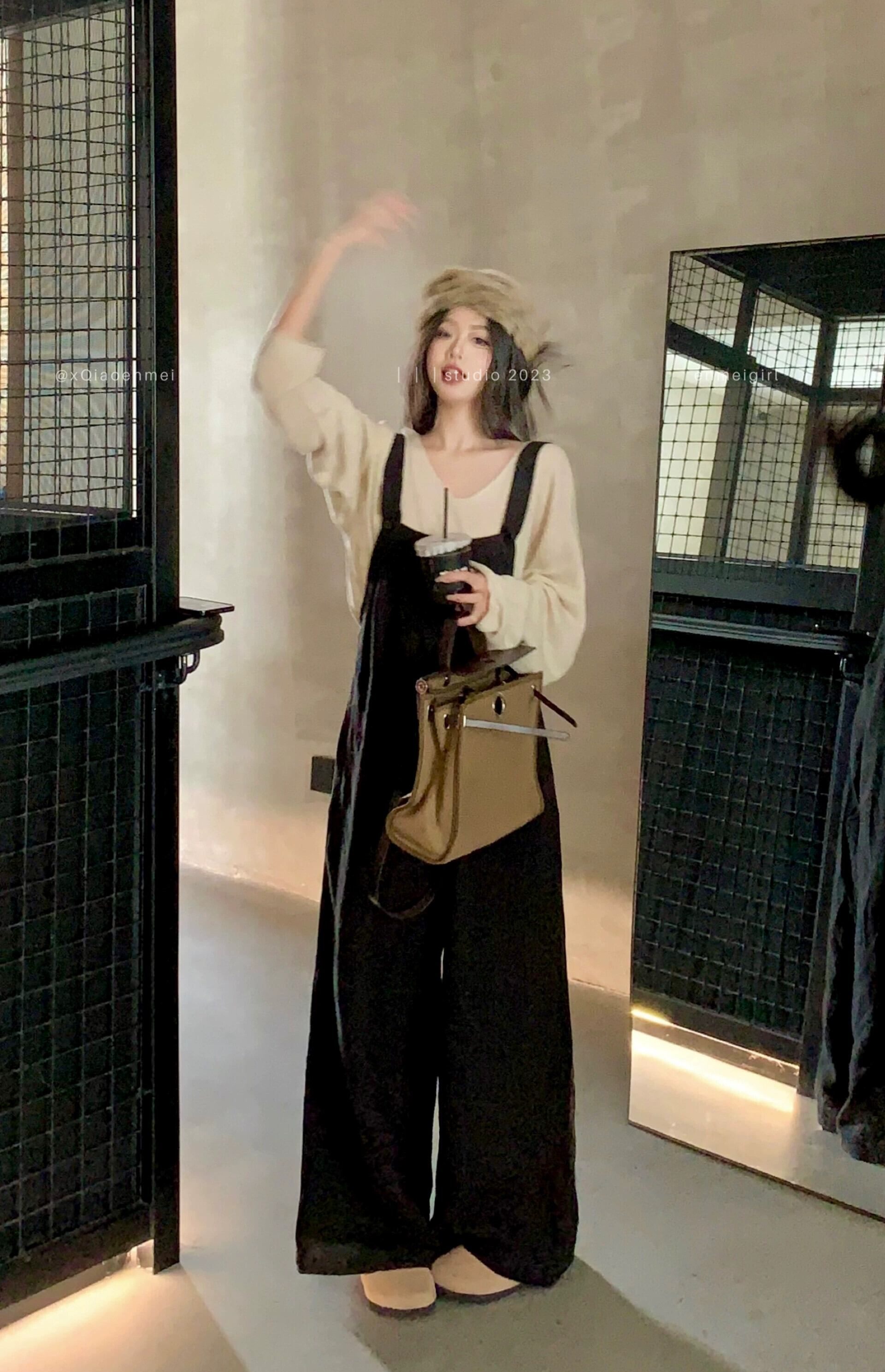 スタイル怠惰なスタイルファッションスーツ女性秋 2023 新しい V ネックニットトップワイドレッグオーバーオール 2 点セット オータム 秋物 Vネック 0921989056711268
