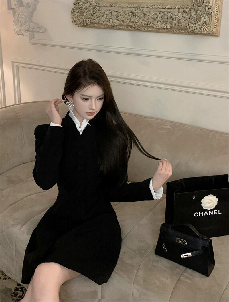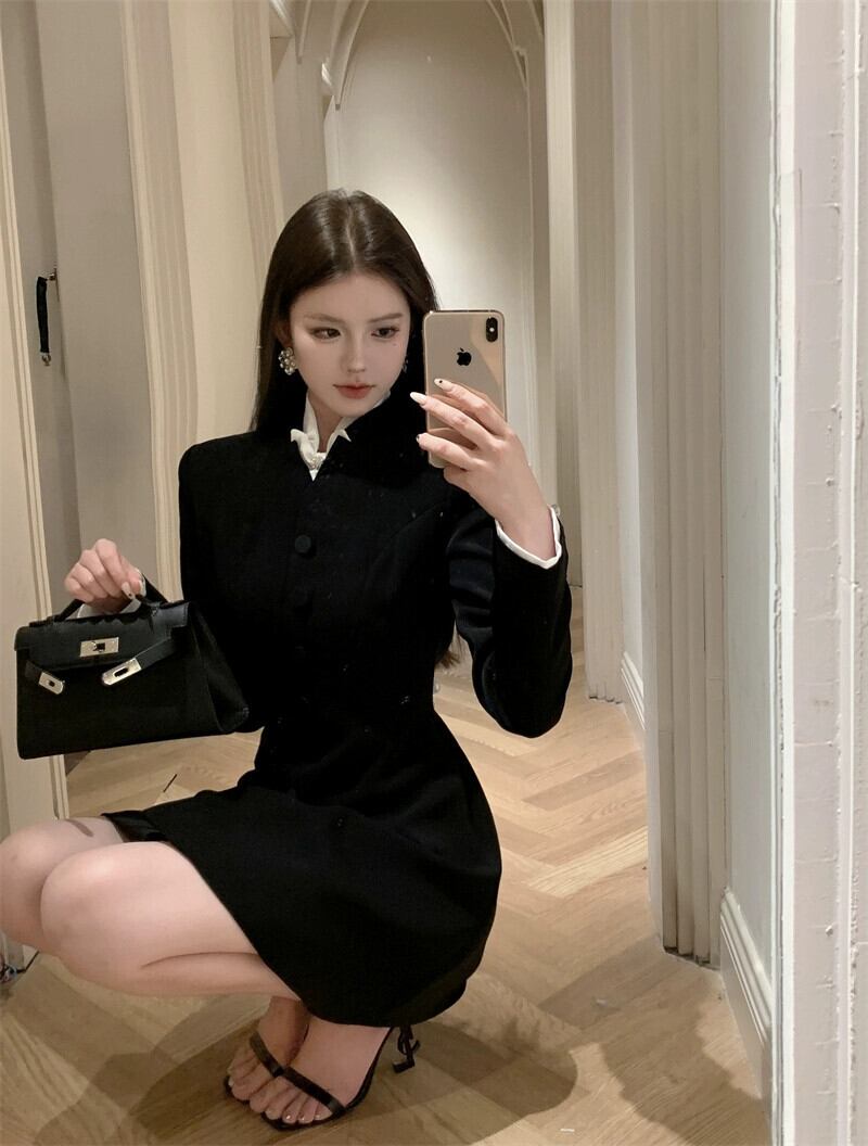 レトロなハイエンドの気質長袖ドレスの女性の秋 2023 新しいスタイルのウエスト痩身デザインニッチショートスカート ロング オータム 秋物 0921993337247887