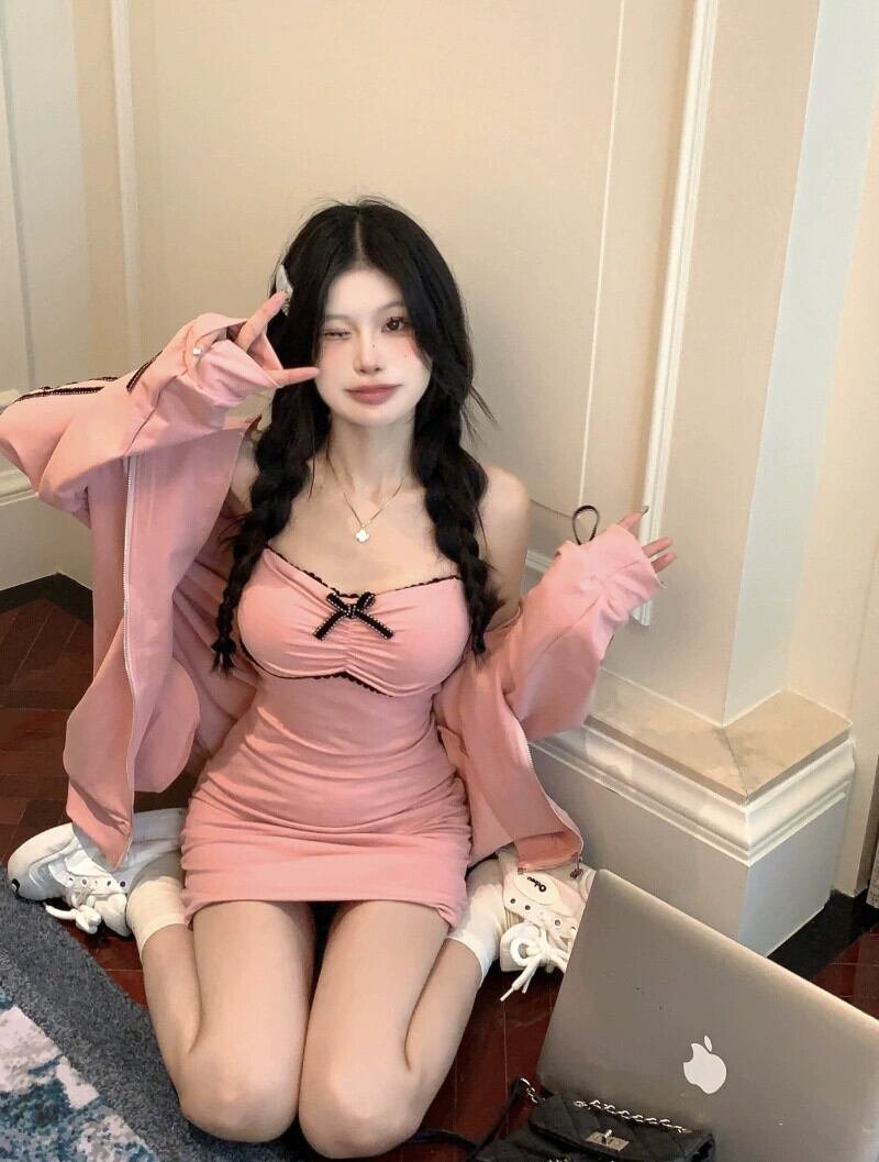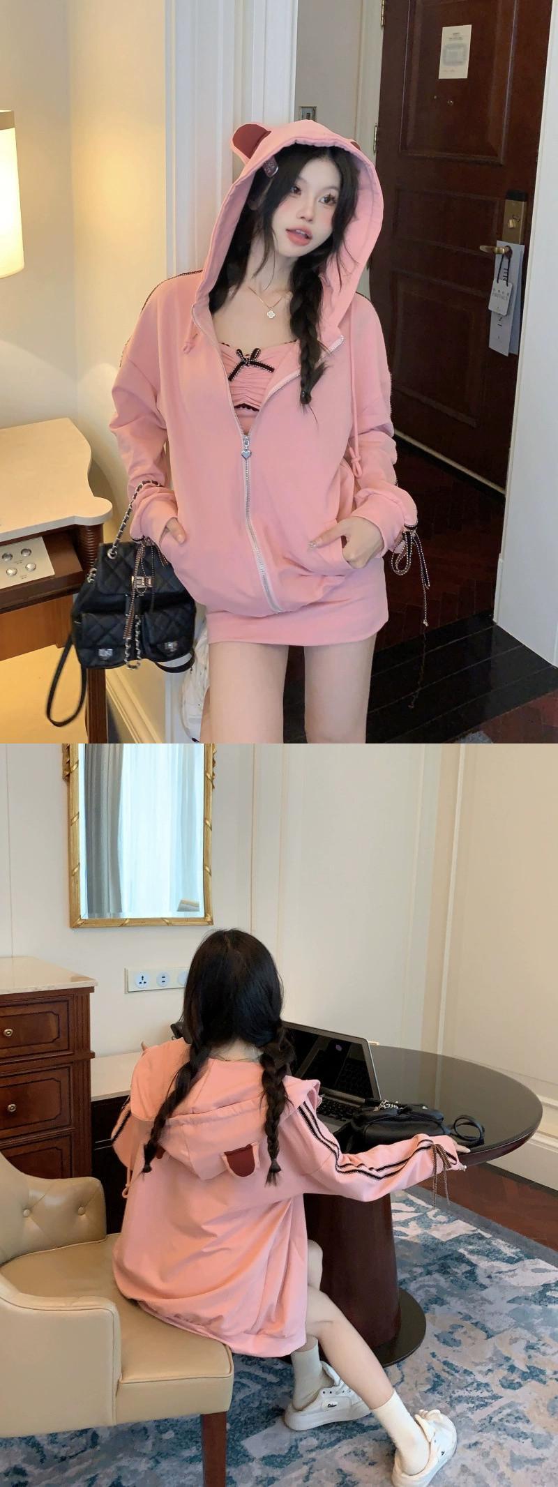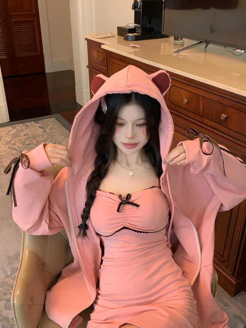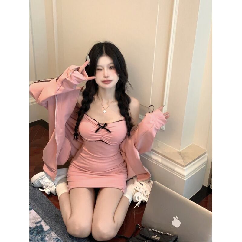 甘いスタイルツーピースセット女性秋 2023 新しいサスペンダードレスフード付きスウェットシャツジャケットピンクのスーツ 大人ガーリー スウィート キュート カジュアル オータム 秋物 0921957229816216