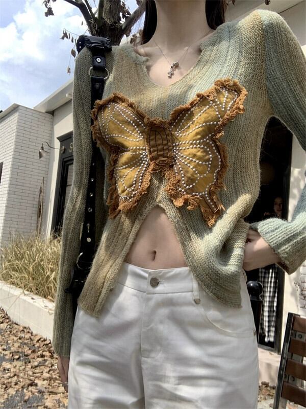 ニッチバタフライ長袖セーターレディース2023秋新作コントラストカラースリットスリムスリムセーター ロング オータム 秋物 0921945069310408