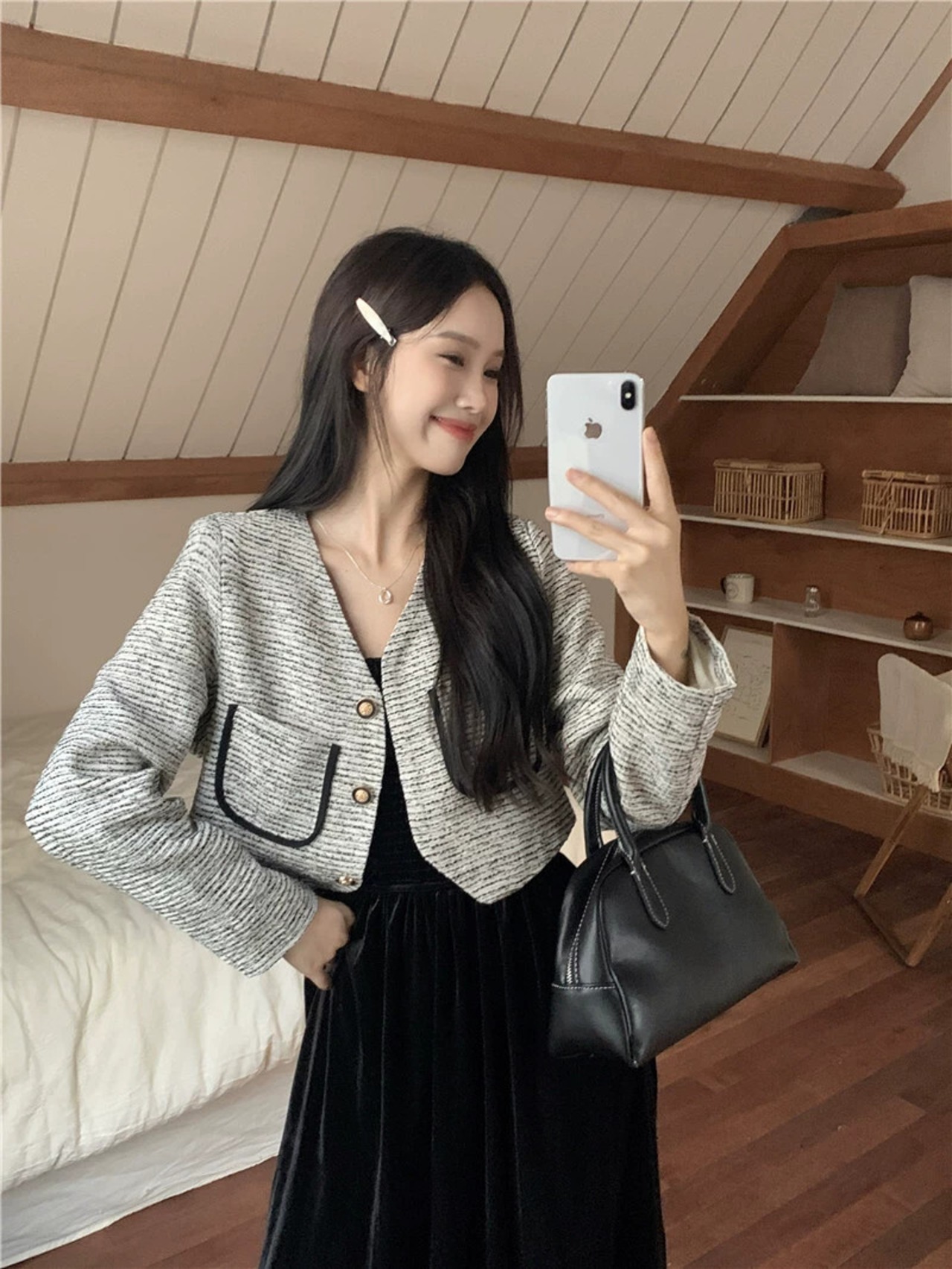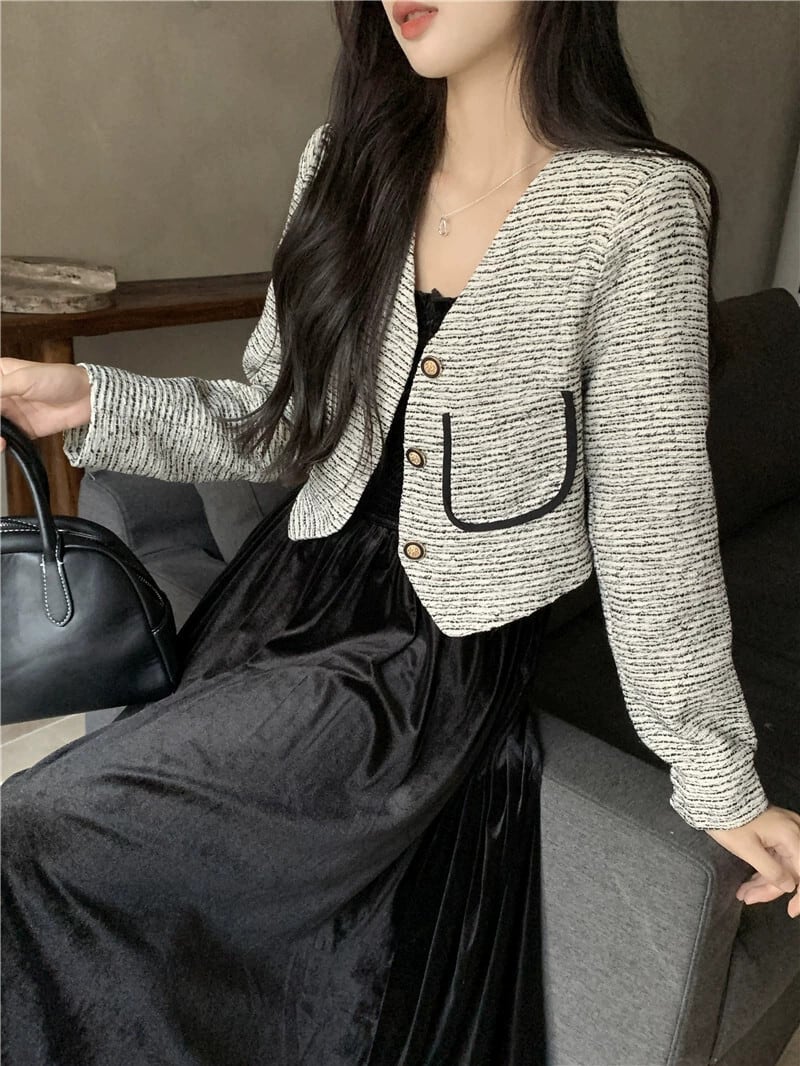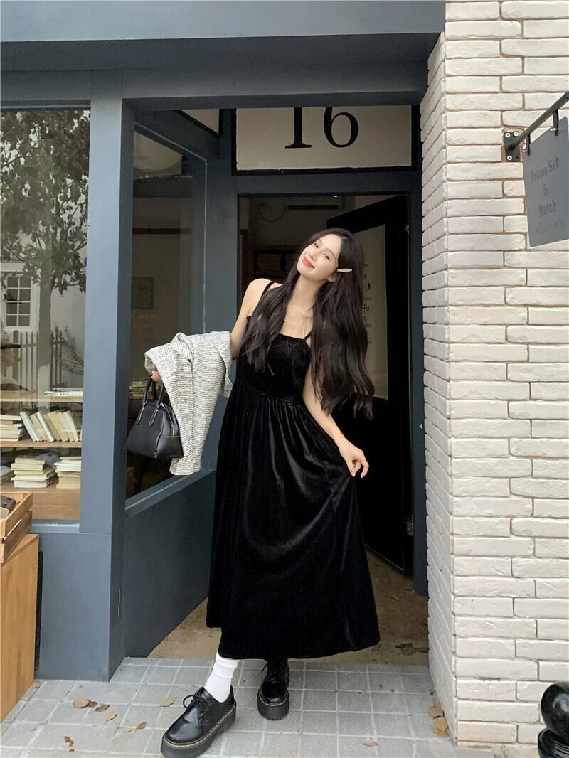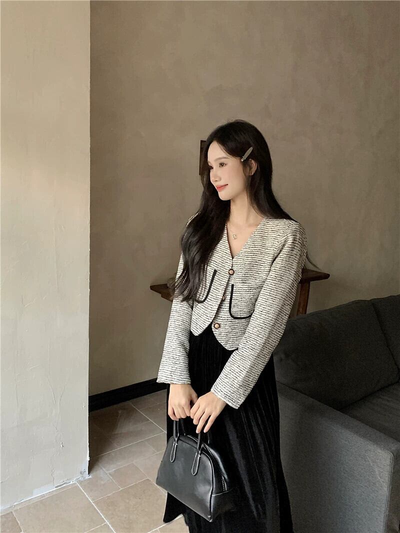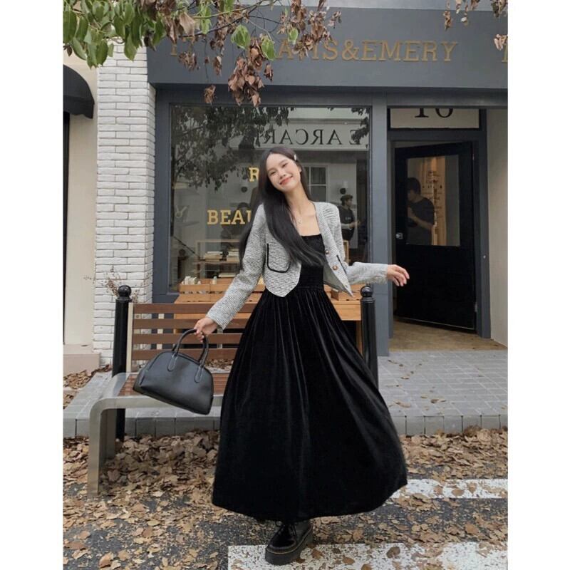 フランスのティーブレイクスーツ女性 2023 秋の新しい気質ベルベットサスペンダースカート小さな香りのスタイル長袖ジャケット 2 点セット ロング オータム 秋物 0921965947532848