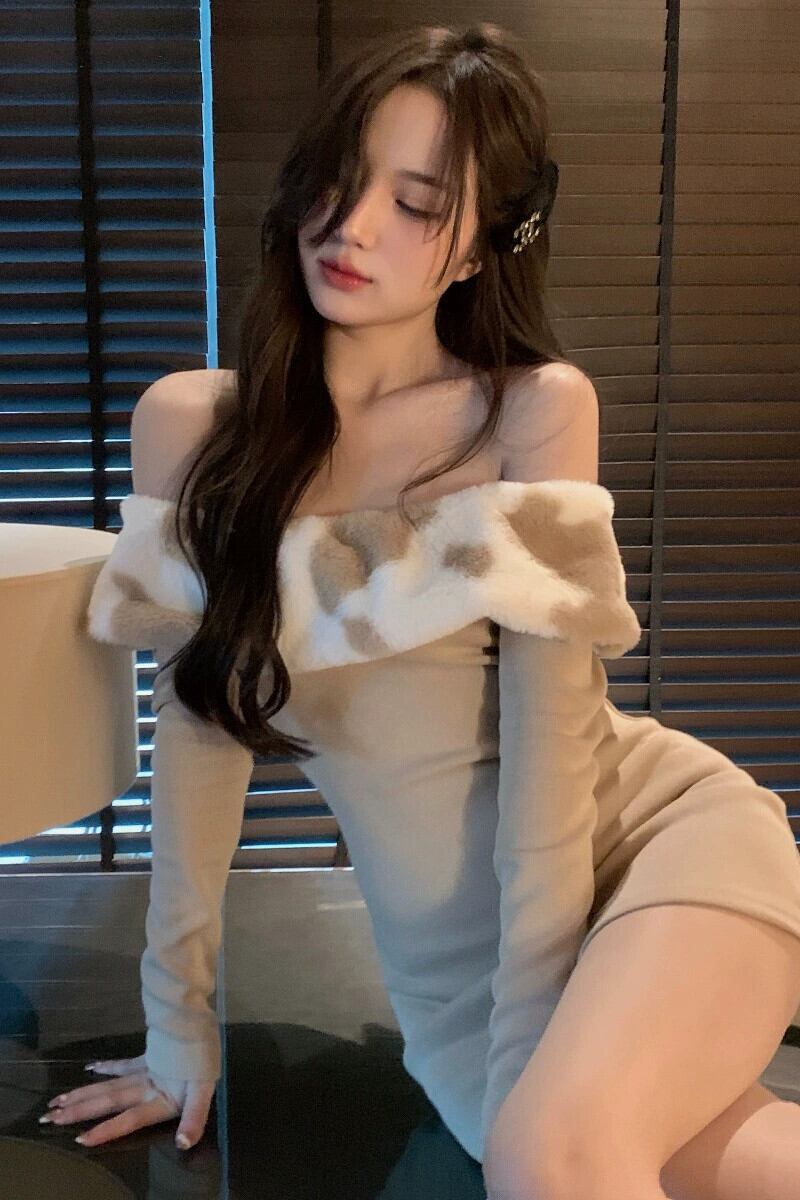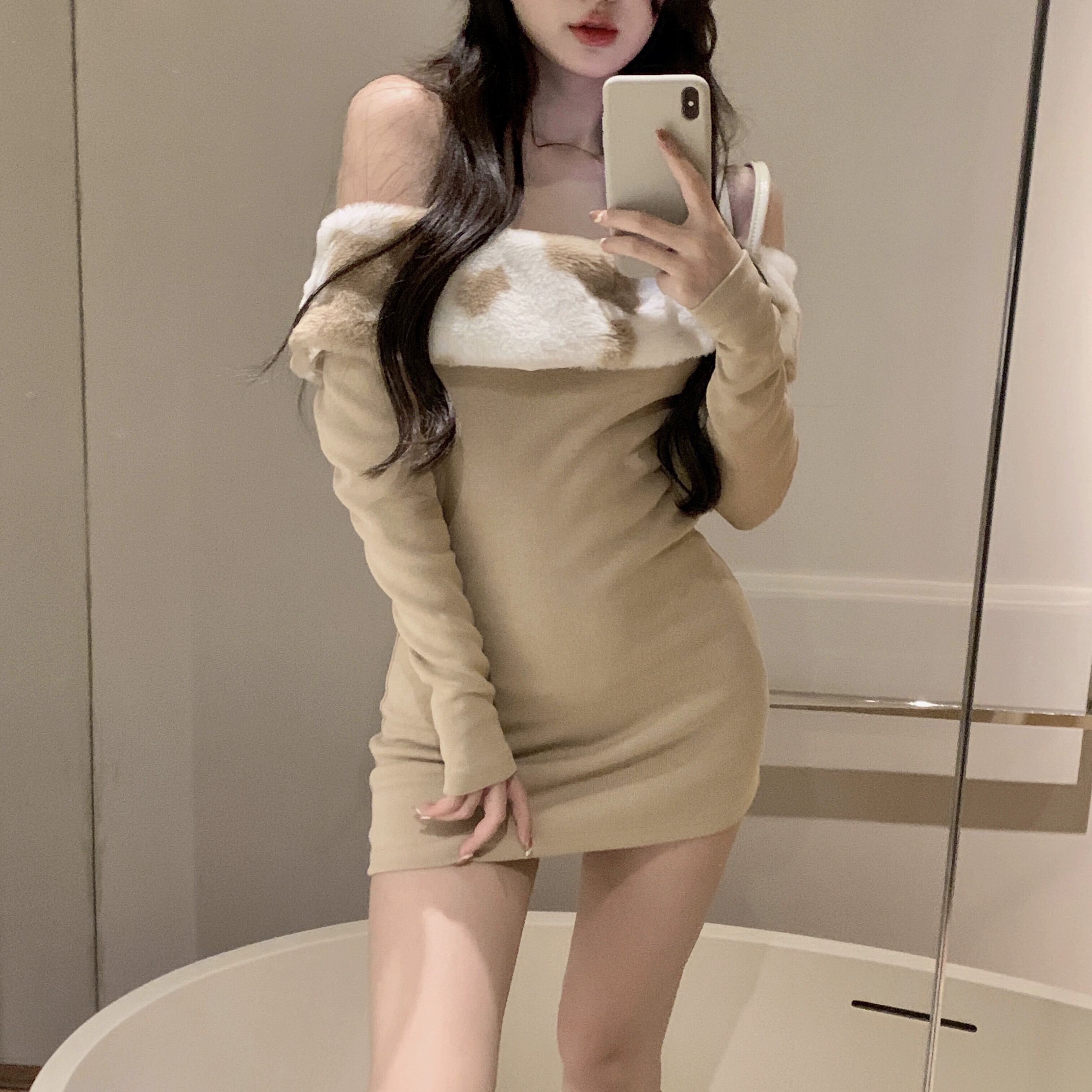 純粋な欲望のソフトでワックス状のワンショルダー スプライシングファーカラードレス女性 2023 秋の新しいスリムフィットとヒップハグボトスカート オータム 秋物 0921974572108393