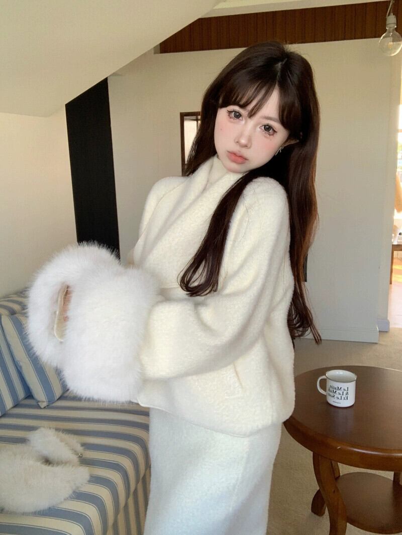 色:クリーミーな白いコート,クリーミーな白いスカート,アプリコットセーター