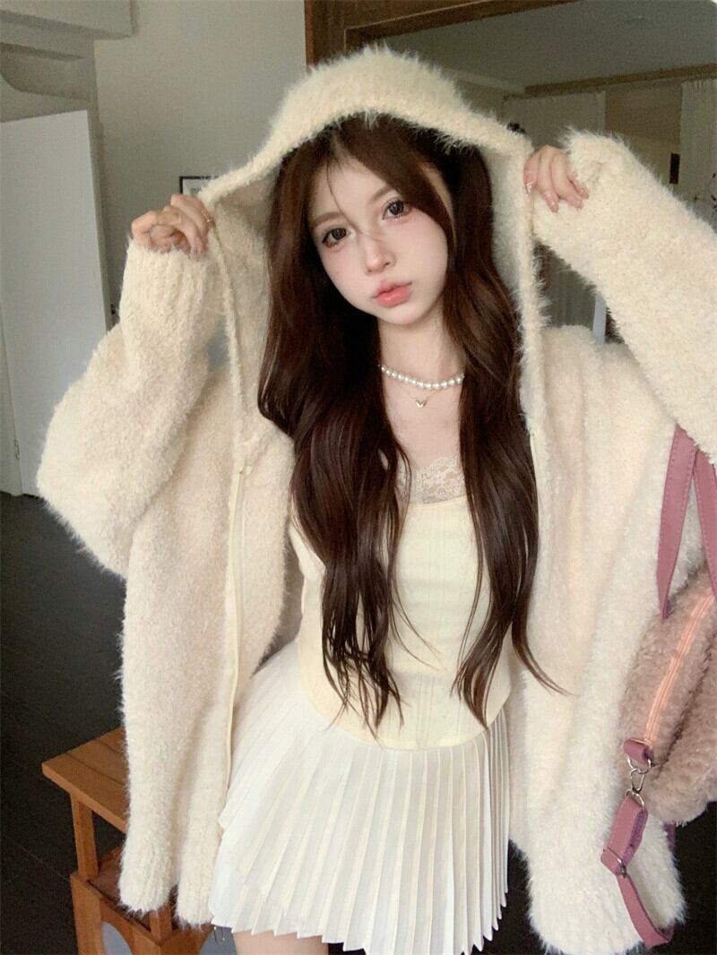 色:クリーム色のフード付きジャケット,アプリコットベスト,アプリコットプリーツスカート