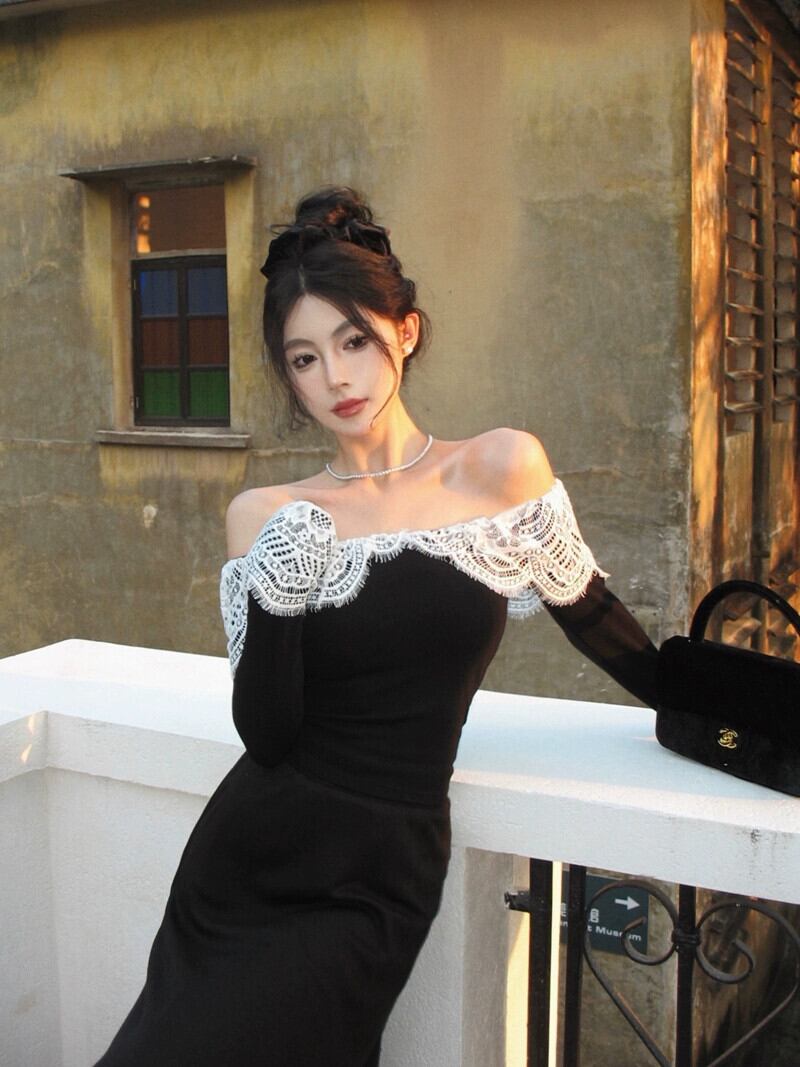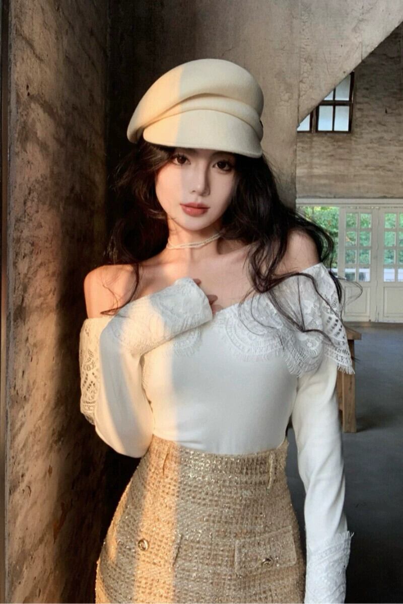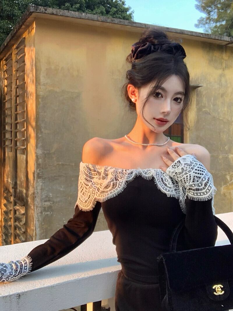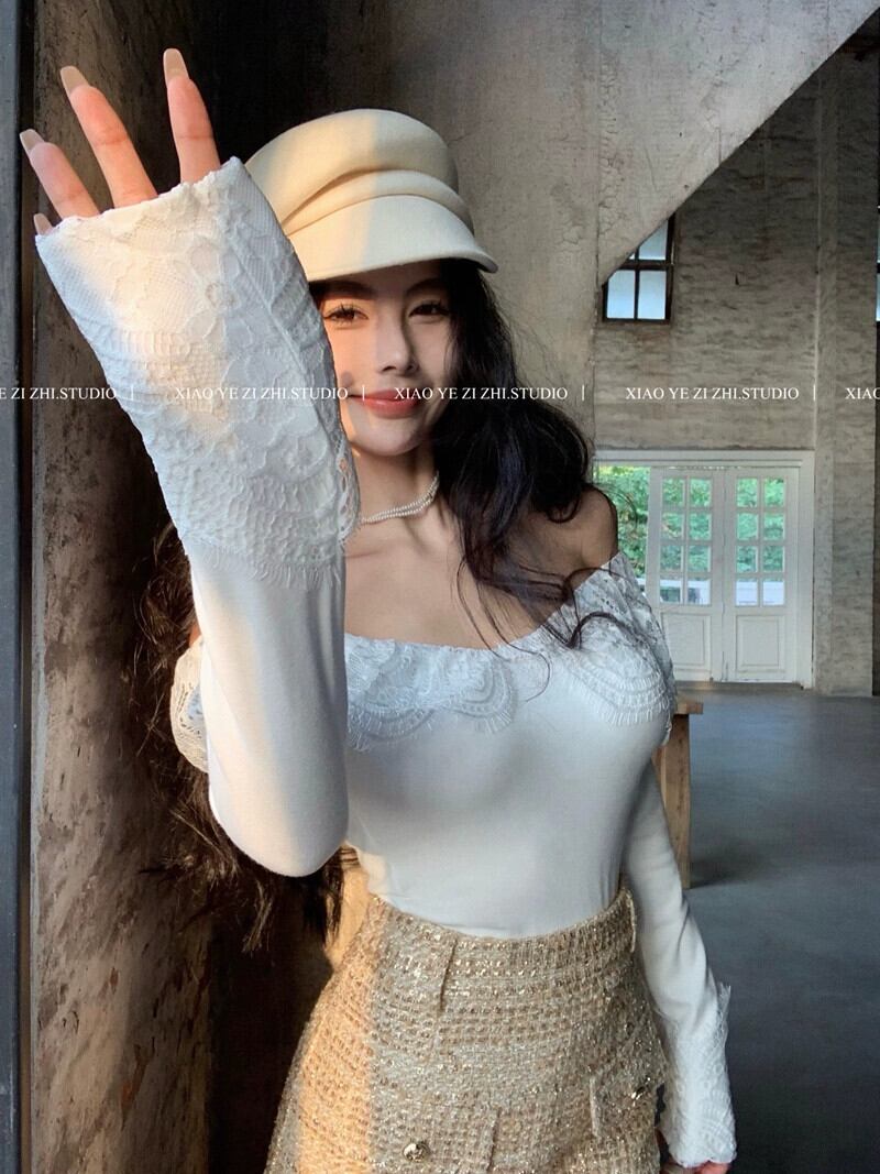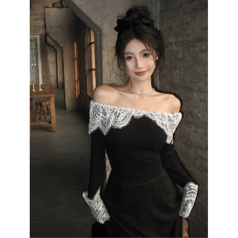フレンチヘップバーンスタイルのセクシーなワンライン襟 Tシャツ女性春 2024 新しいオフショルダーレースインナーボトリングシャツ スプリング 春物 0921911885607943