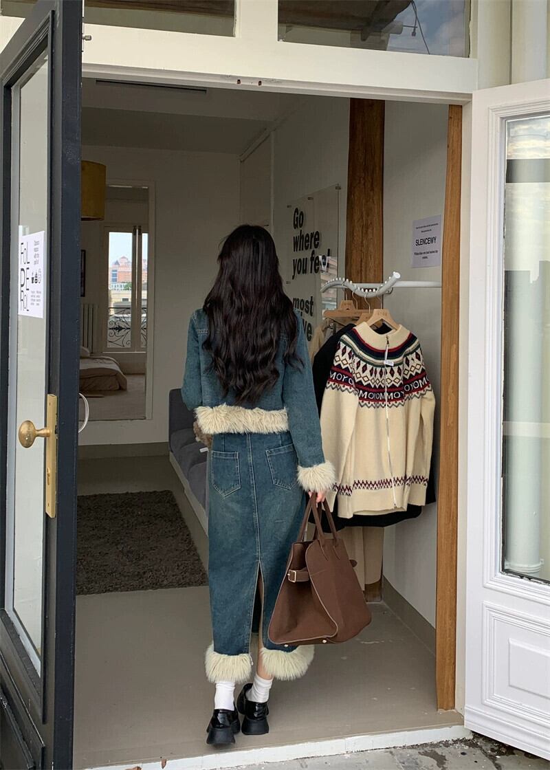 アメリカン レトロ デニム スーツ レディース 2024 冬 ぬいぐるみ ショート ジャケット 毛皮のようなスカート 2 点セット ウィンター 冬物 0921959525029943