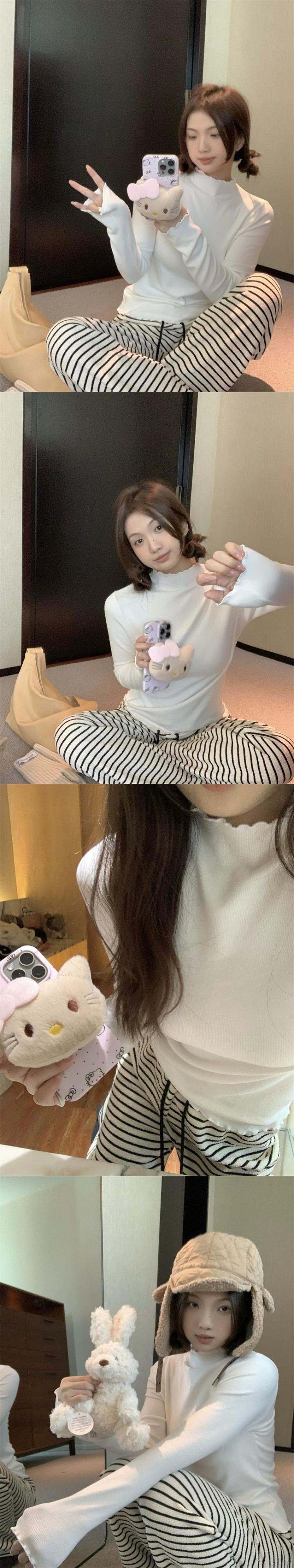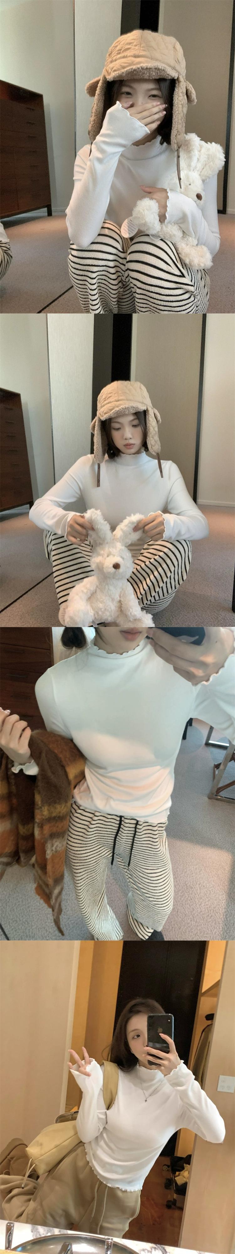 春のクリーム ピンクのキノコ縁ハーフハイカラー ニット T シャツ、起毛インナー、スリムな長袖トップ、ベースレイヤー シャツ ロング スプリング 春物 Tシャツ 0921939867474028