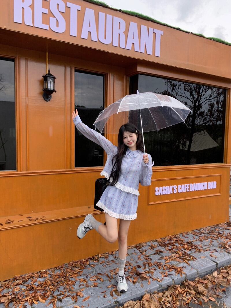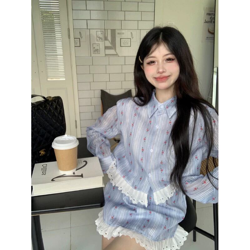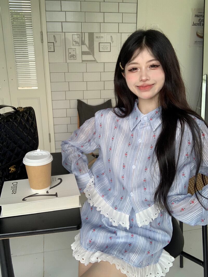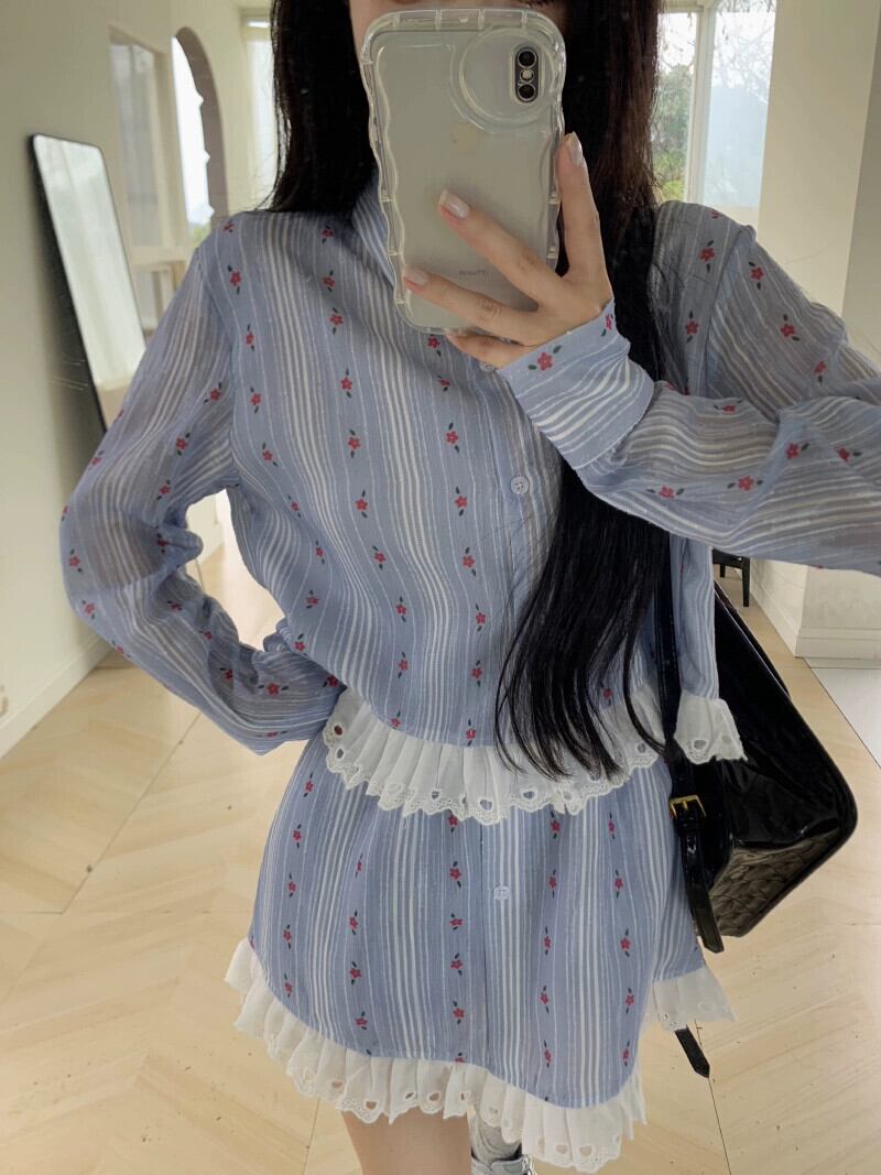 甘いスタイル年齢低減スーツ女性 2024 春の新ストライプスプライシングレースシャツ痩身スカート 2 点セット 大人ガーリー スウィート キュート カジュアル スプリング 春物 0921942570978778