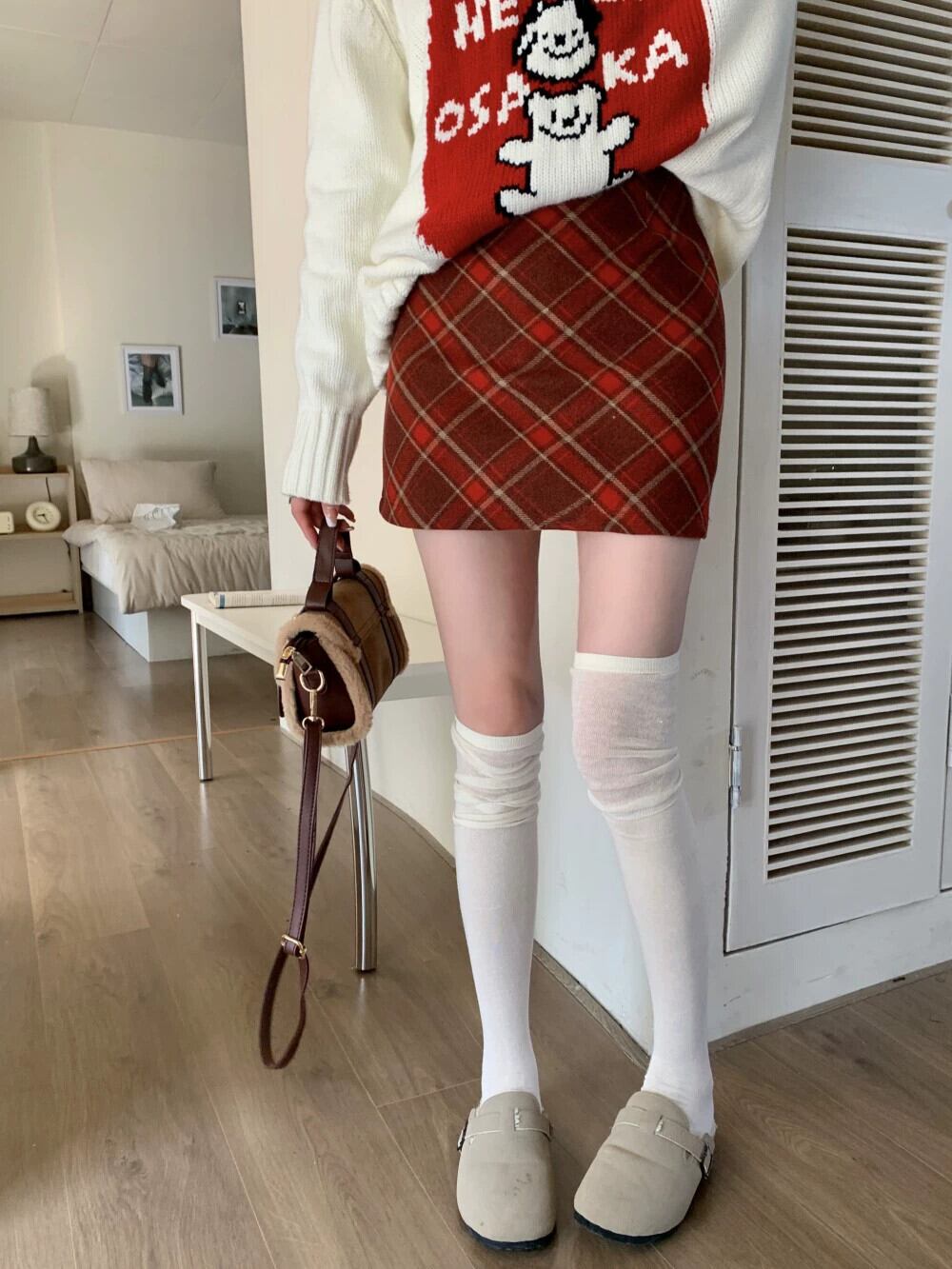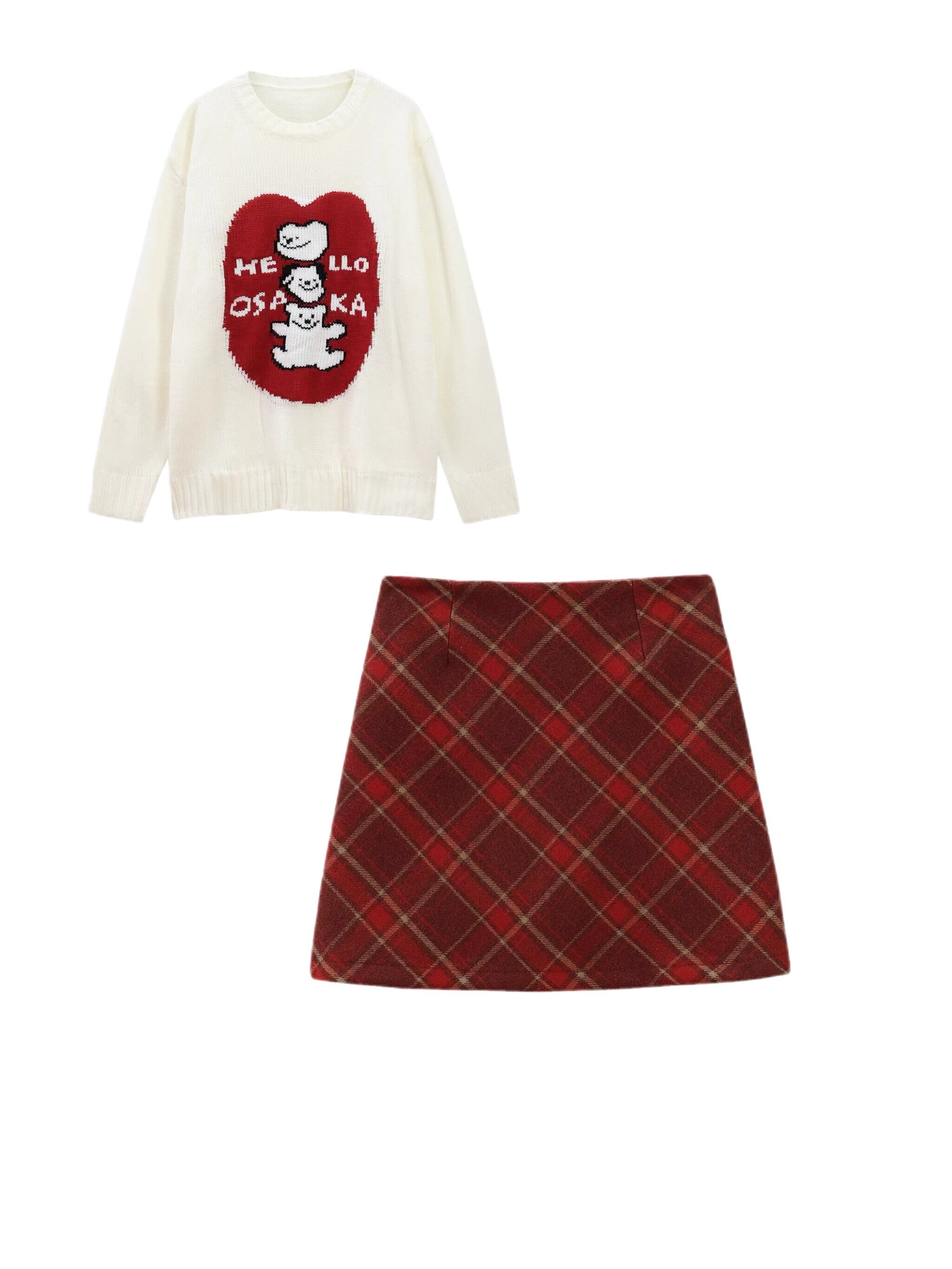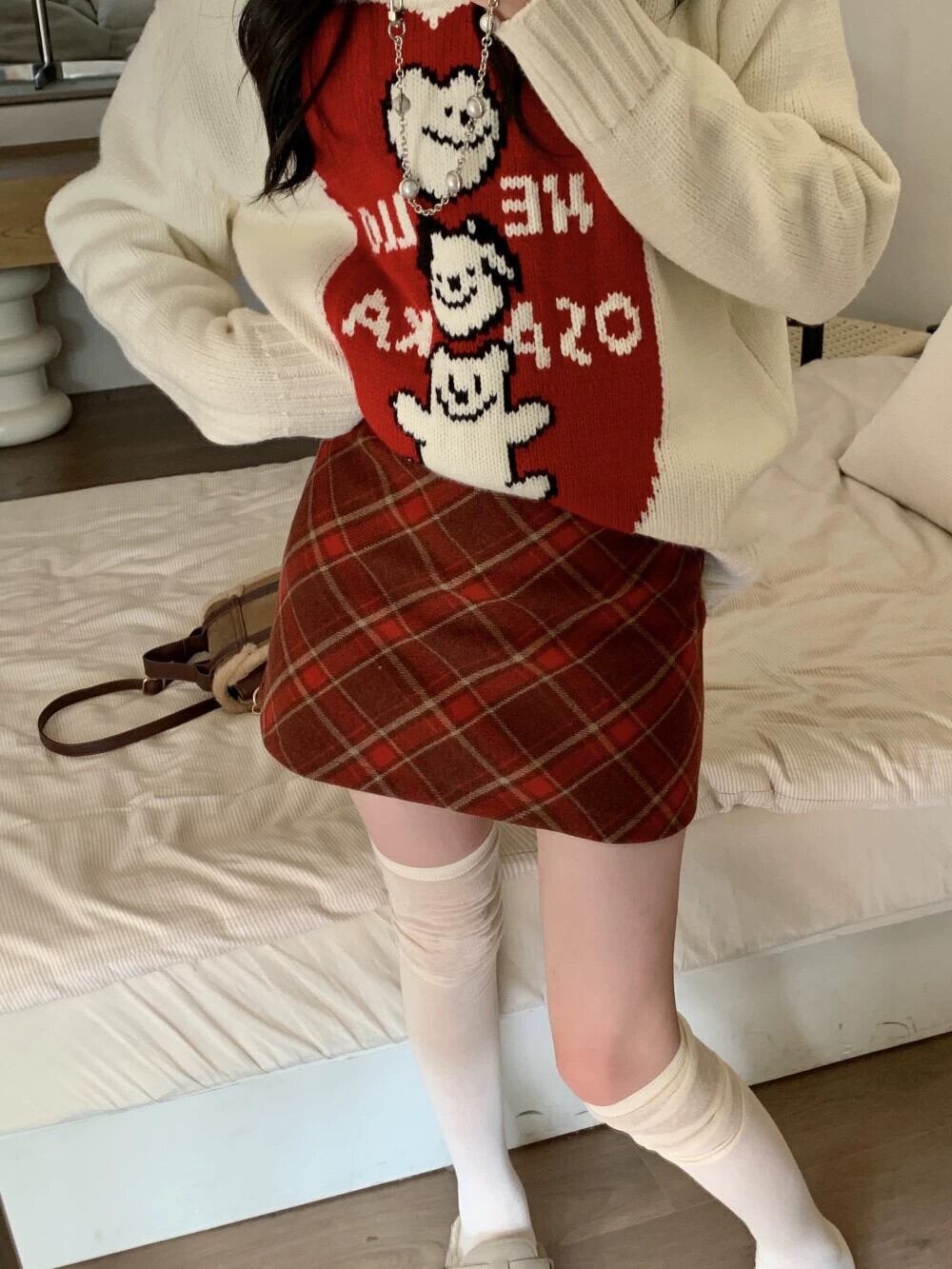 クリスマス漫画ジャカードセーター女性の冬の雰囲気衣装セット赤チェック柄ウールスカート 2 点セット レッド ウィンター 冬物 0921973674560115