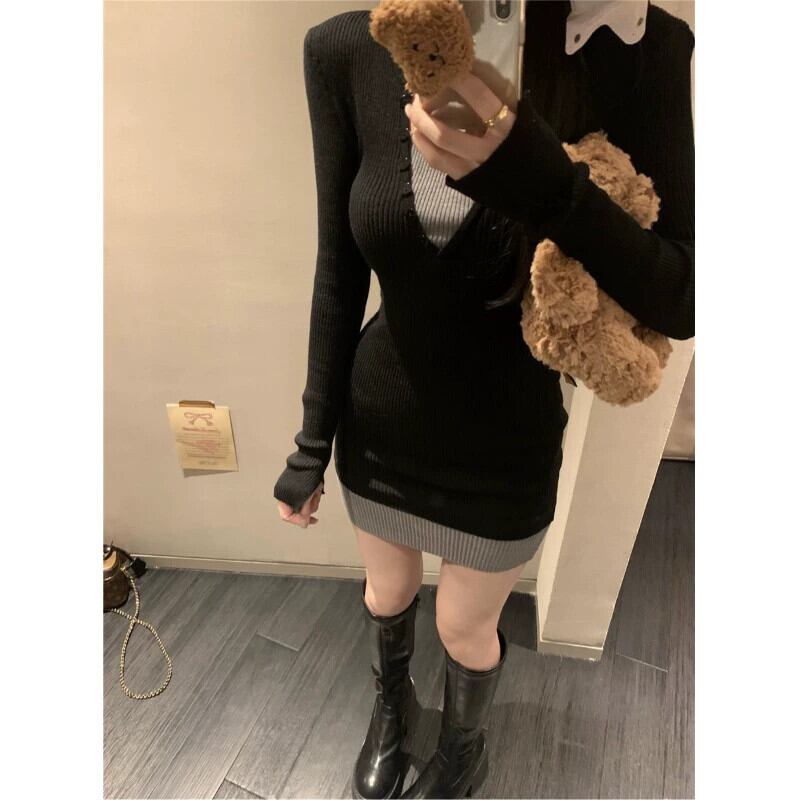 コントラストカラーデザイン偽ツーピースニットドレス女性春 2024 新しいボトミング痩身ヒップハグショートスカート スプリング 春物 092192922196661