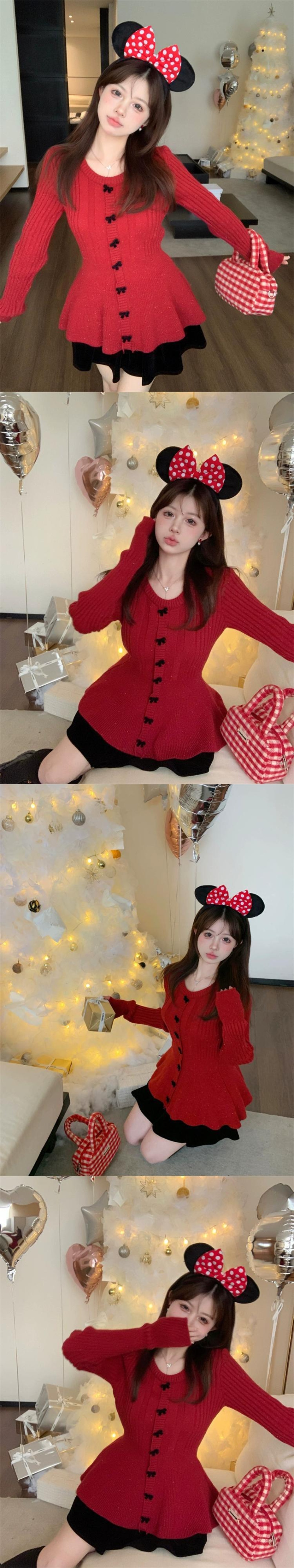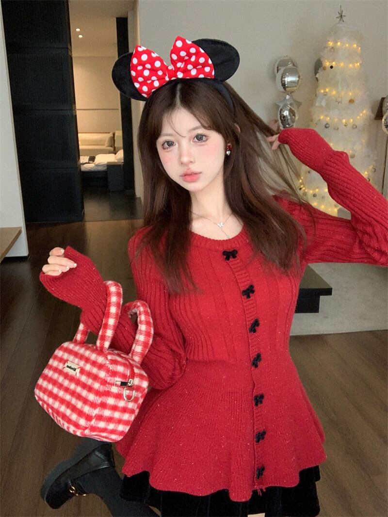 クリスマスと年赤いリボン長袖セーター女性春 2024 新デザインウエスト痩身トップ ロング レッド スプリング 春物 0921966675872048