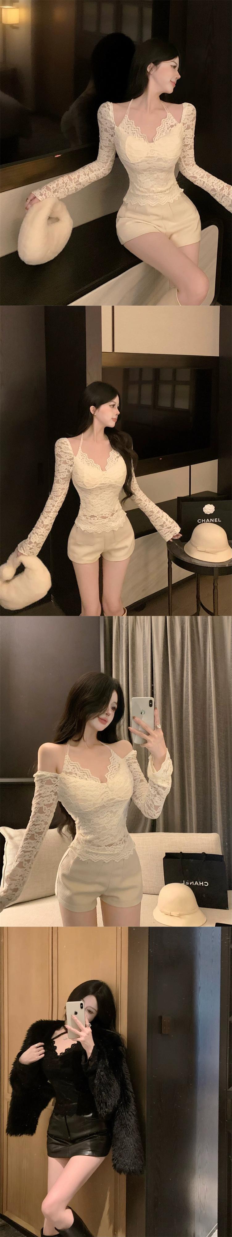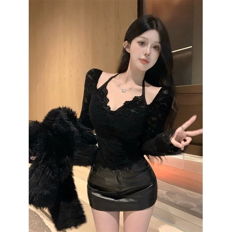 純粋な欲望セクシーなレースのホルターネック長袖レースシャツ女性春 2024 新しいスタイルの気質スリム痩身底トップ ロング スプリング 春物 0921959436010379