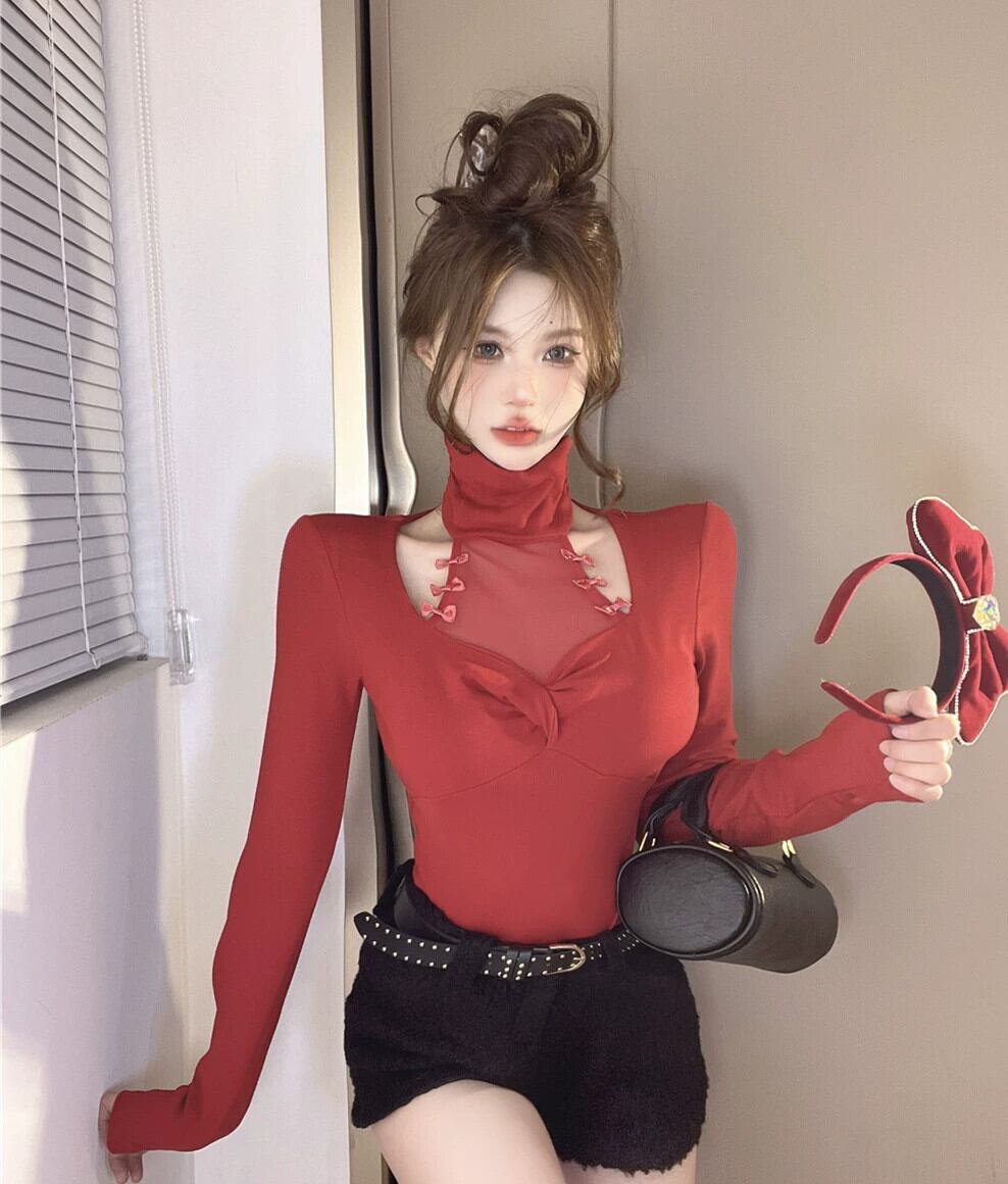 純粋な欲望スタイル弓メッシュスプライシング長袖 Tシャツ女性春 2024 新しい気質スリムスリムトップトレンディな ロング リボン スプリング 春物 0921933410771049