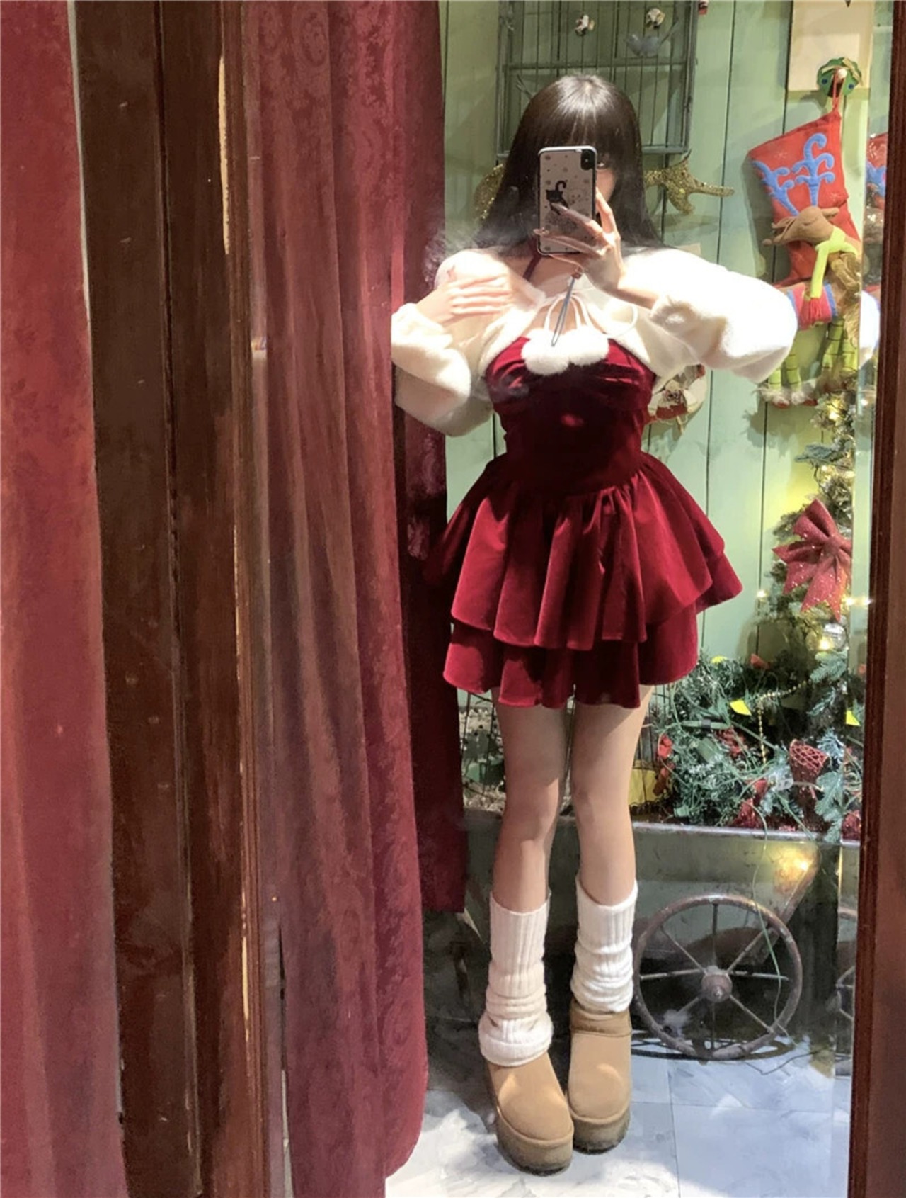 ガーリースタイル クリスマス衣装 レッド ホルターネック ふわふわドレス 冬 ファーリーチョッキ 2点セット ウィンター 冬物 0921985115560381