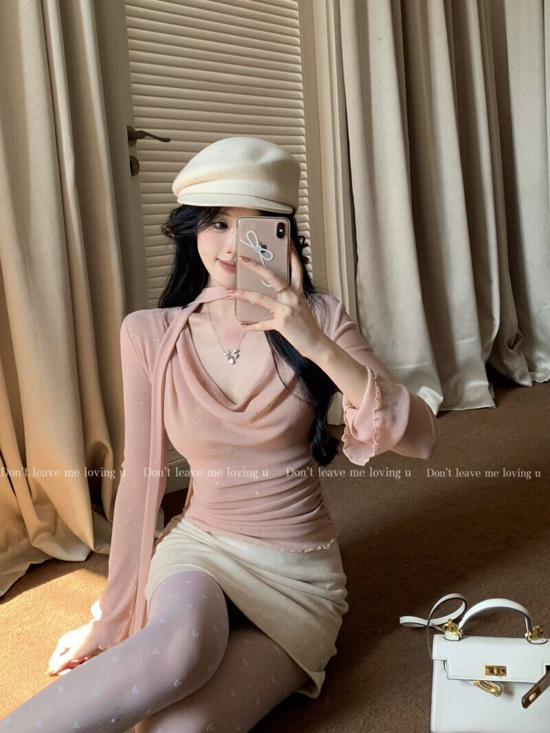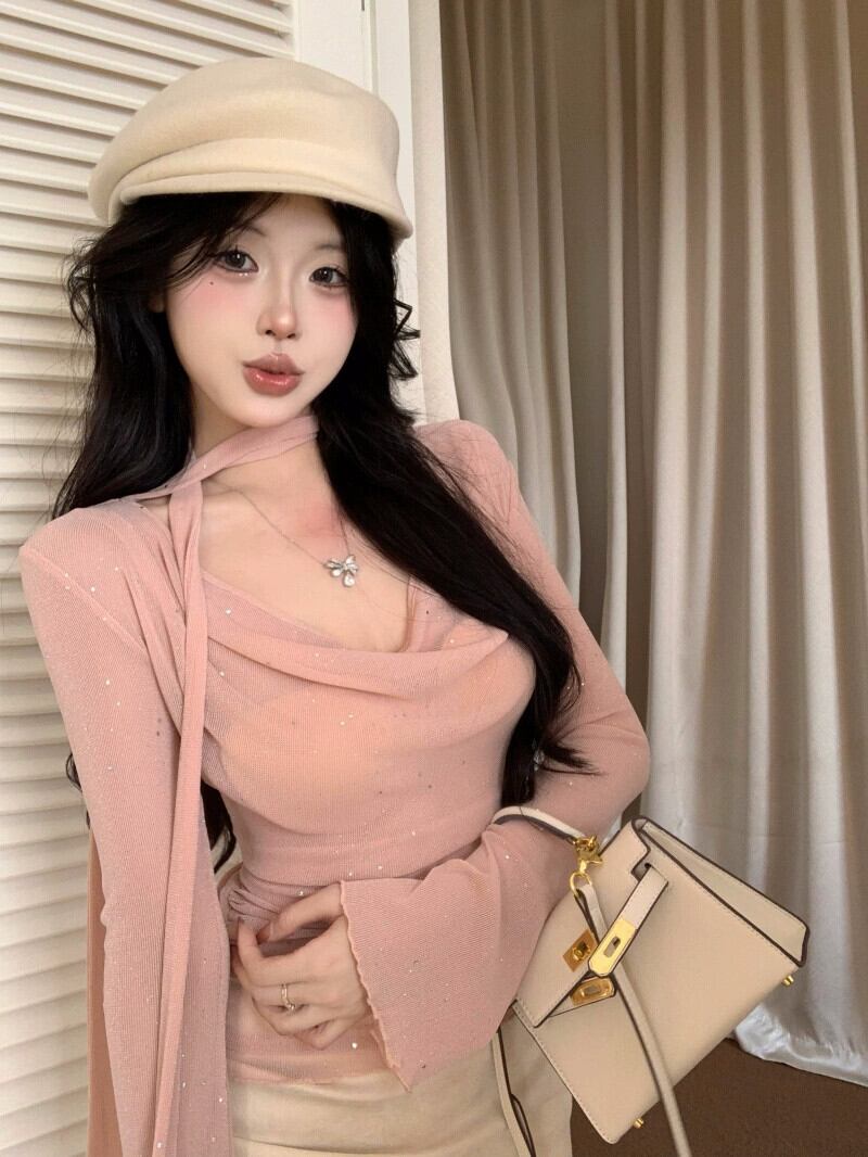 重工業スパンコールわずかにシースルー襟長袖 Tシャツ女性春 2024 新スタイル純粋な欲望ネクタイスリム痩身ボトリングシャツ ロング スプリング 春物 ピュア 0921955551432424