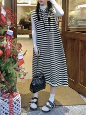 ese フード付きノースリーブベストドレス女性春 2024 新しい多用途ルーズスリムストライプミッドレングススカート スプリング 春物 0921978058641281