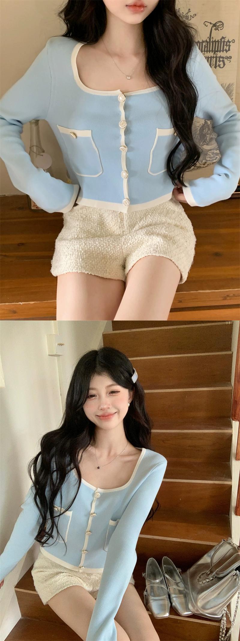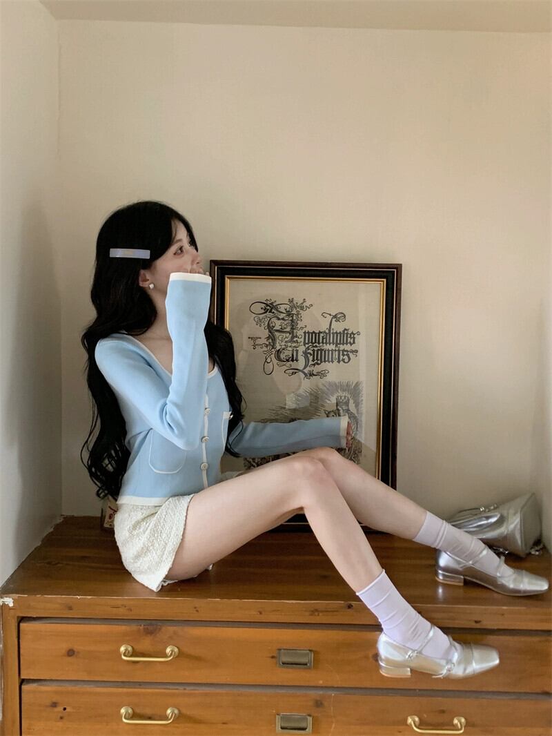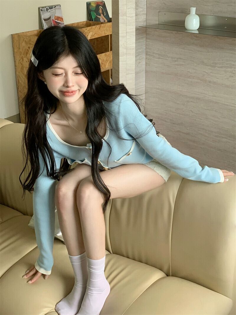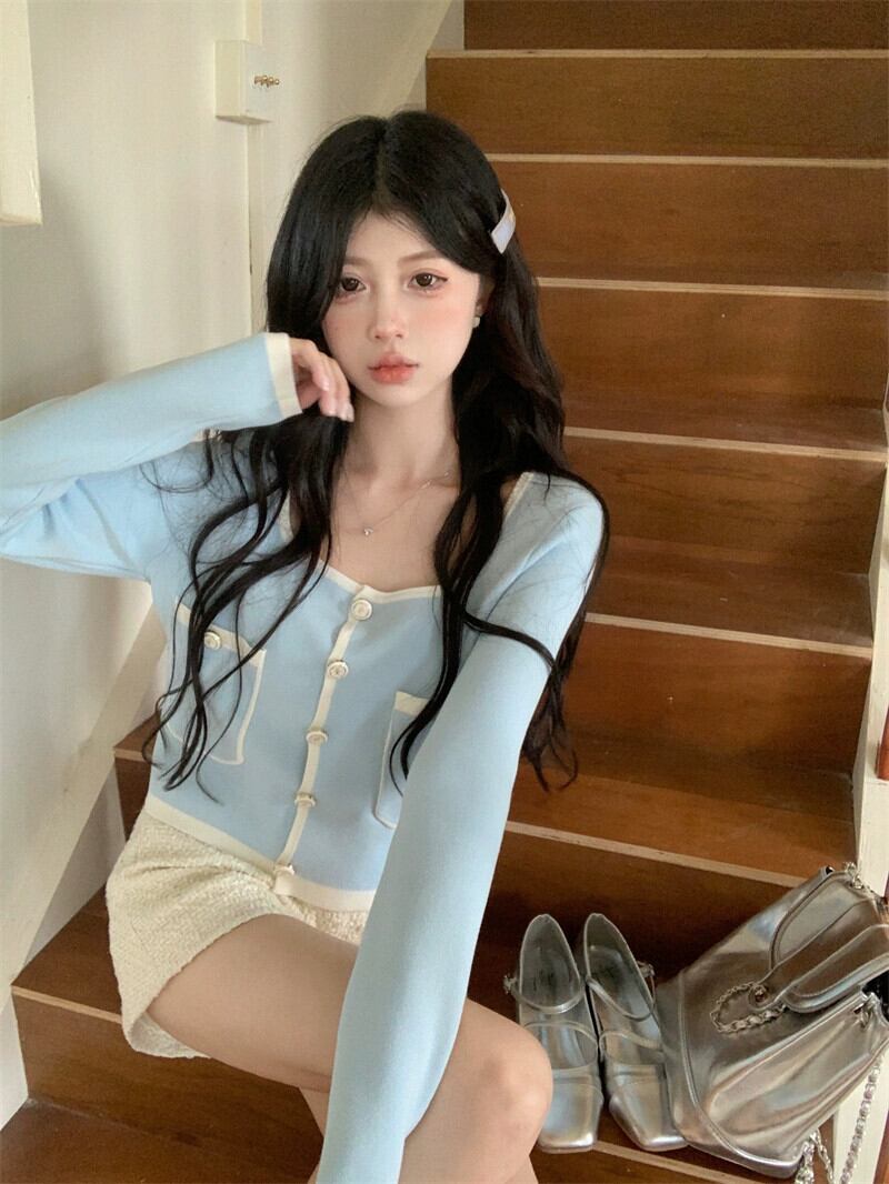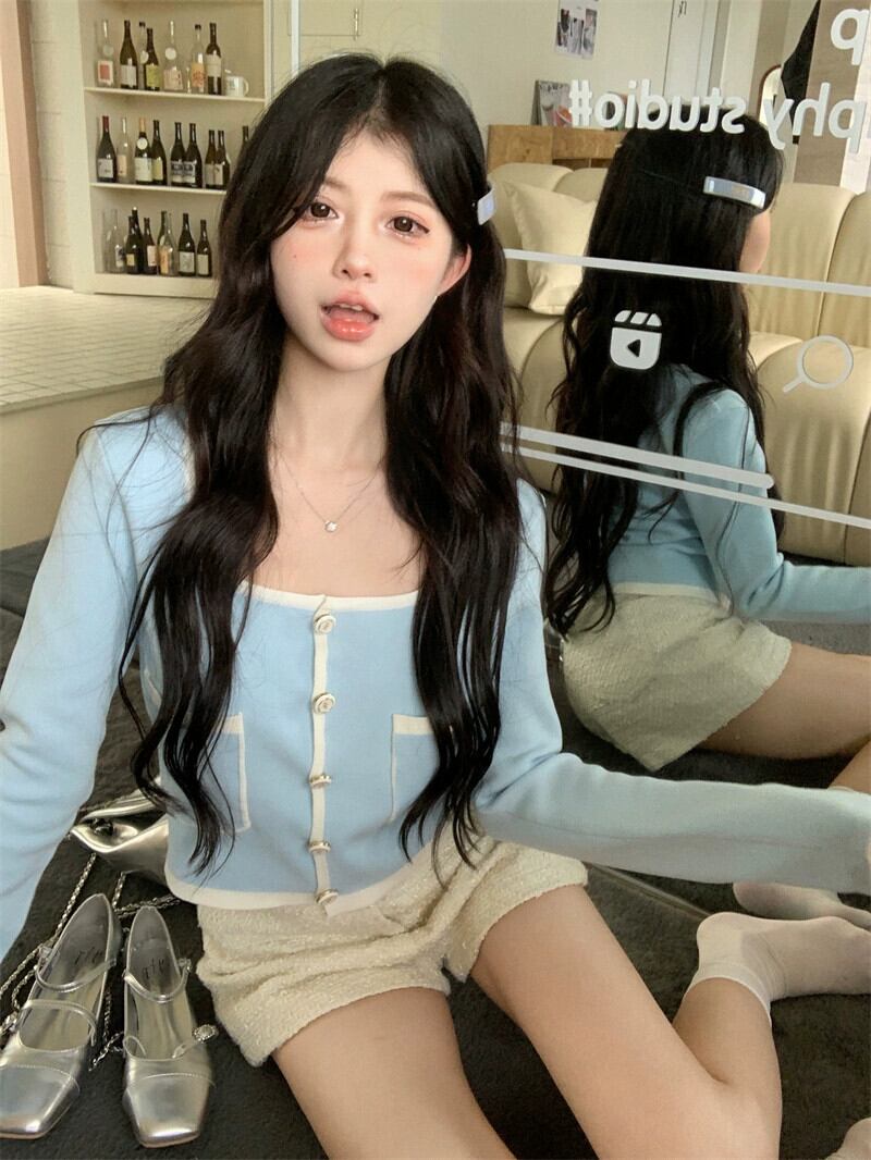 優しいスタイルの青と白のカラーブロック長袖セーター女性 2024 年春の新しいスタイルの気質ショートスリムスリムトップトレンディ ロング ホワイト ブルー スプリング 春物 0921958599673903