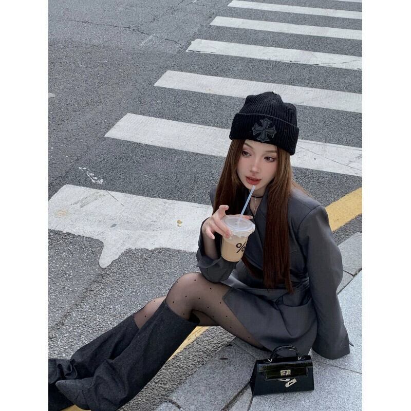 グレーのハイエンドウエスト気質ブレザー女性の秋冬 2024 新しいミドル丈カジュアルスーツトップ オータム 秋物 ウィンター 冬物 092199663389995