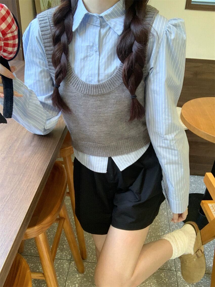 スタイル年齢を軽減するカレッジ スタイル スーツの女性、スプリング ショート ストライプ シャツ、レイヤード ニット ベスト トップ、2 点セット レッド 春物 092199557384391