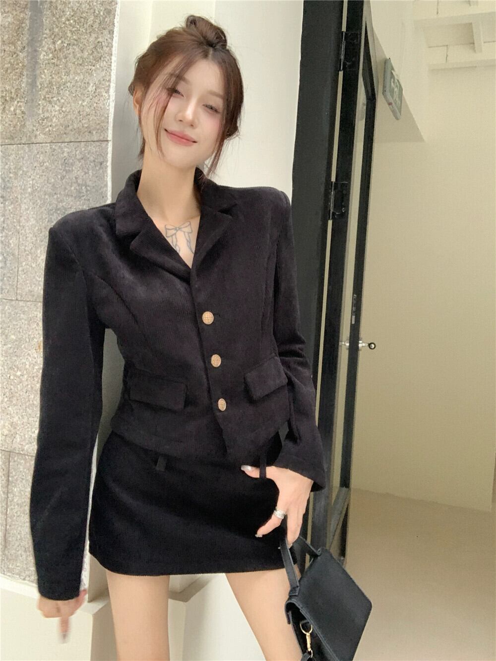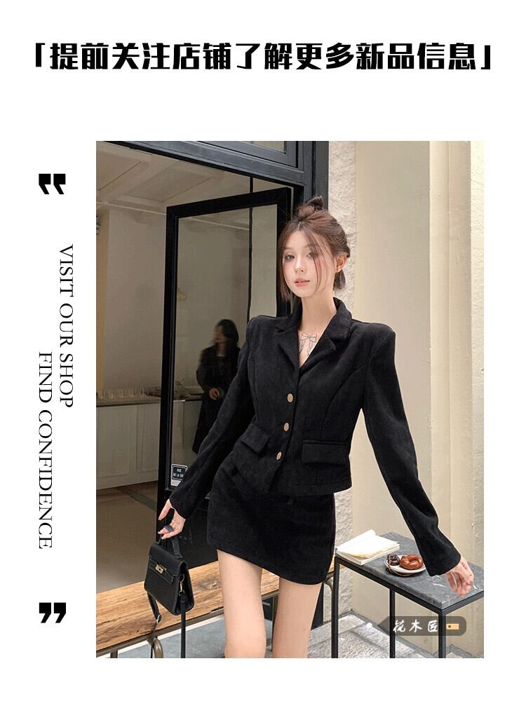 -終わりの気質小さな香りのスーツの女性の 2024 年春の新しい黒のスーツのトップハーフスカート 2 点セット ブラック スプリング 春物 092197927044001