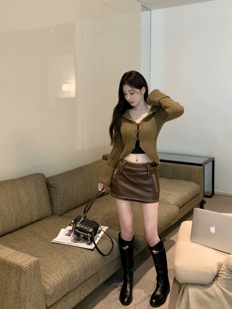 レトロスタイル pu レザースカートスーツ女性春デザインラペルニットカーディガンヒップカバースカート 2 点セット スプリング 春物 0921911780050166