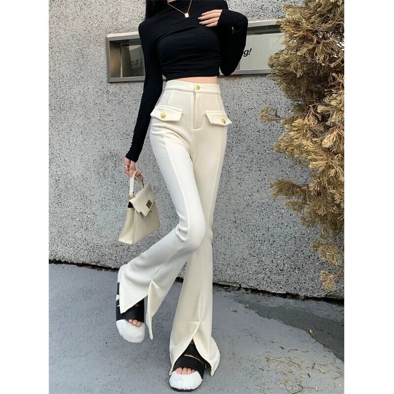 -ウエスト痩身スリットベルベットカジュアルパンツ女性 2024 年春の新デザイン多目的わずかにフレア床長パンツ レッド スプリング 春物 092196452922915