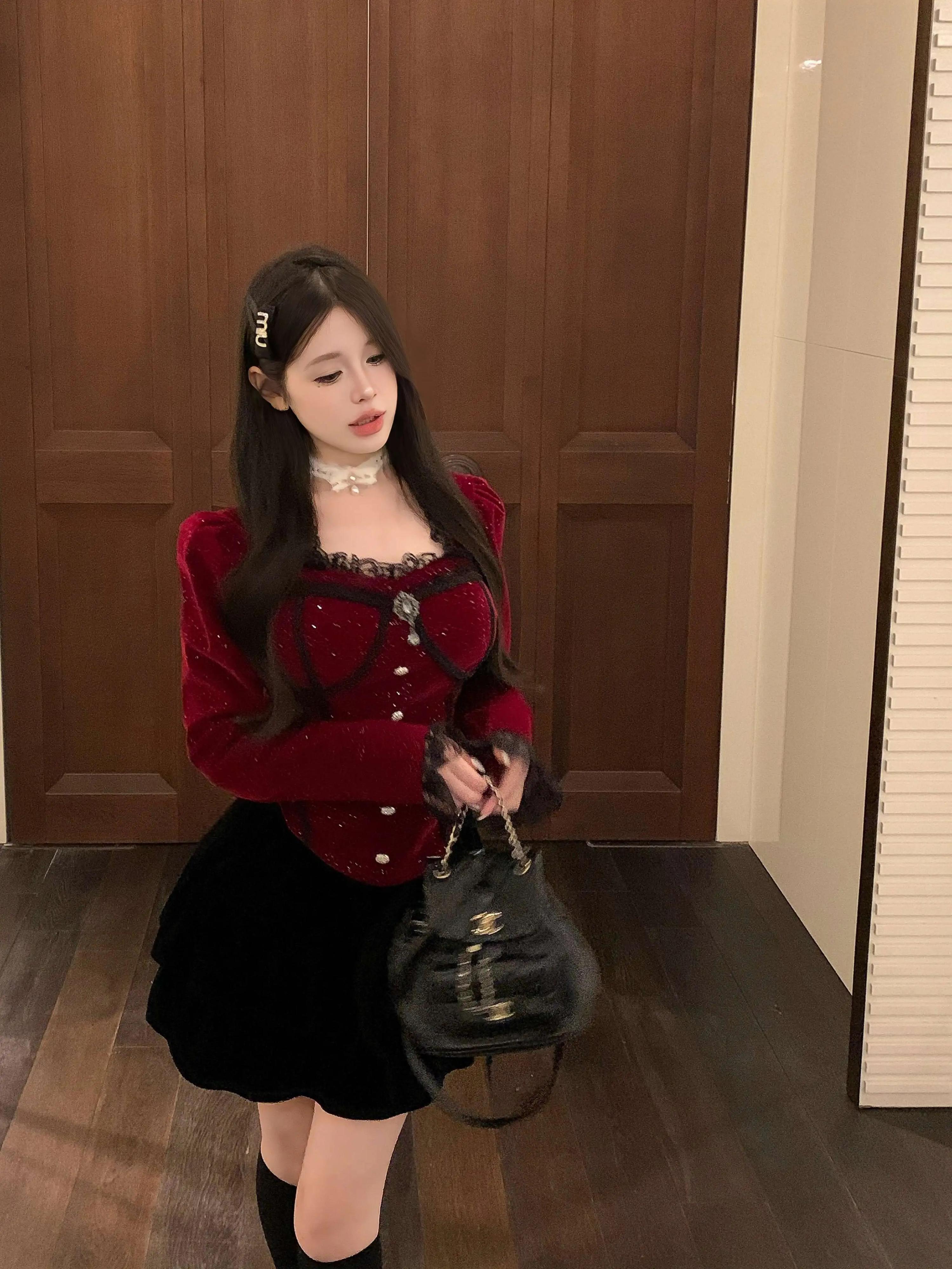 クリスマスベルベットレッド長袖 Tシャツ女性 2024 春の新しい雰囲気ショートスリムフィットスクエアカラートップ ロング スプリング 春物 スクウェア 0921976791648631