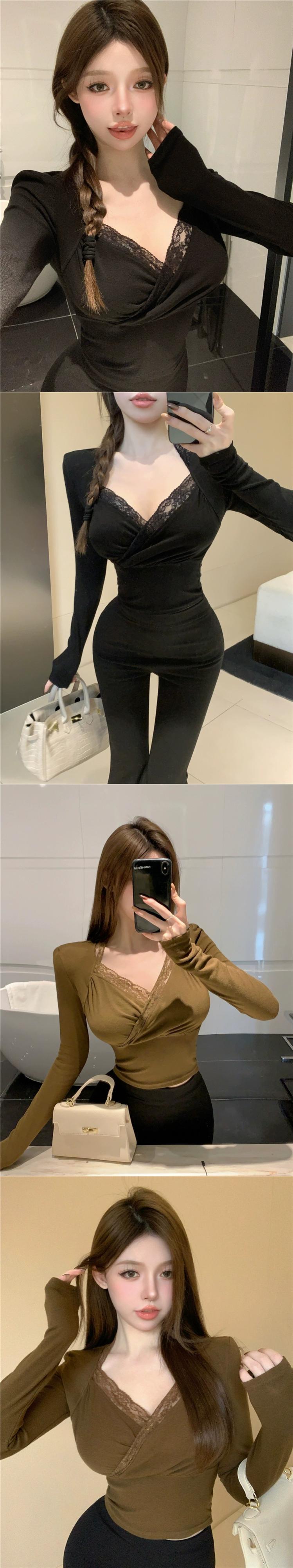 レトロ V ネックレーススプライシング Tシャツ女性春長袖インナーボトシャツスタイルセクシーなタイトなショートトップ ロング スプリング 春物 Vネック 0921939059331998