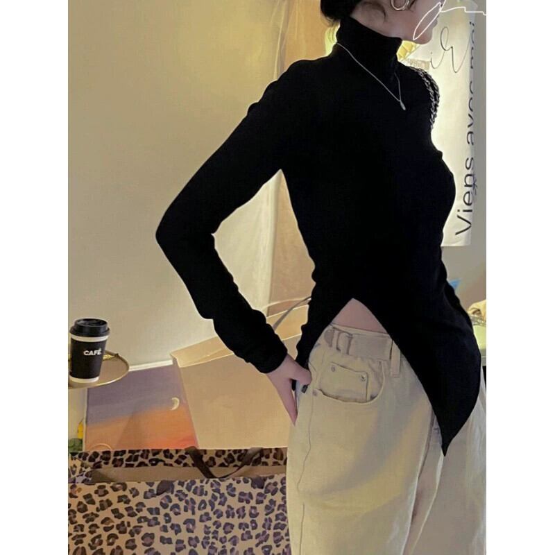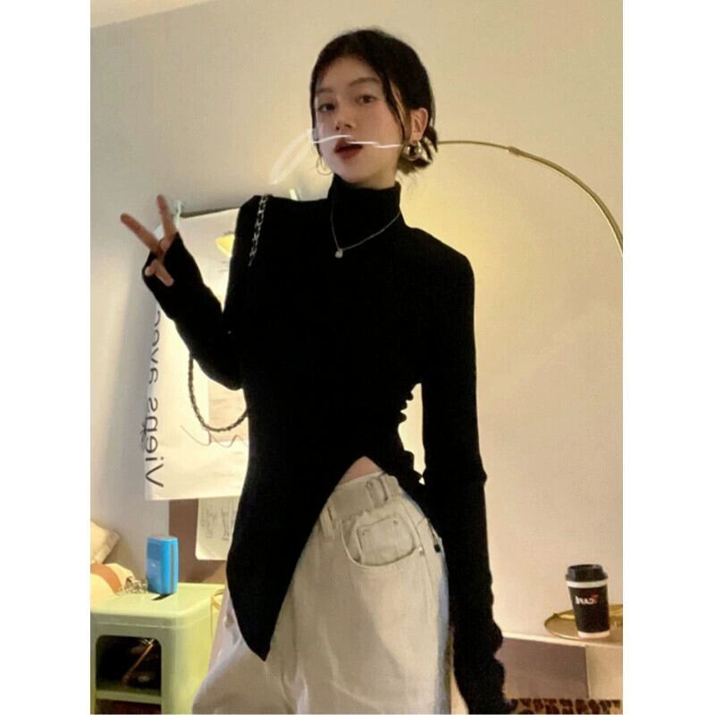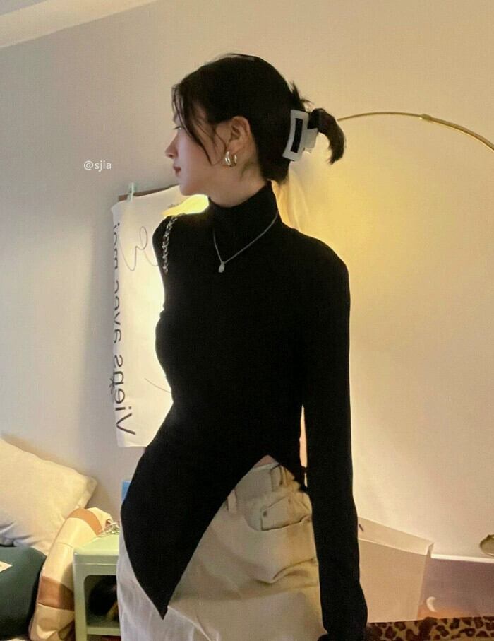 春のハーフハイカラー長袖Tシャツレディース。不規則なスリットが入ったホットなタイトなトップスと黒のボトムのシャツ ロング ブラック スプリング 春物 0921966152028636