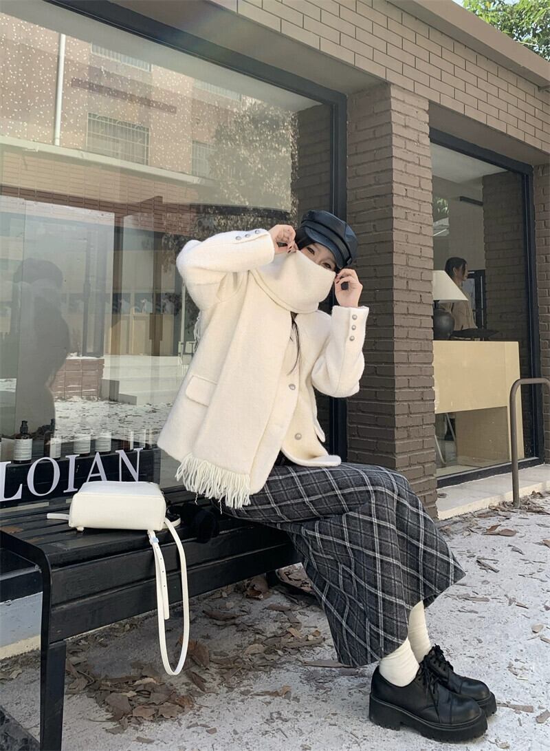 色:ホワイトウールコート,アプリコットウールコート,コーヒー色のチェック柄スカート,グレーチェック柄スカート
