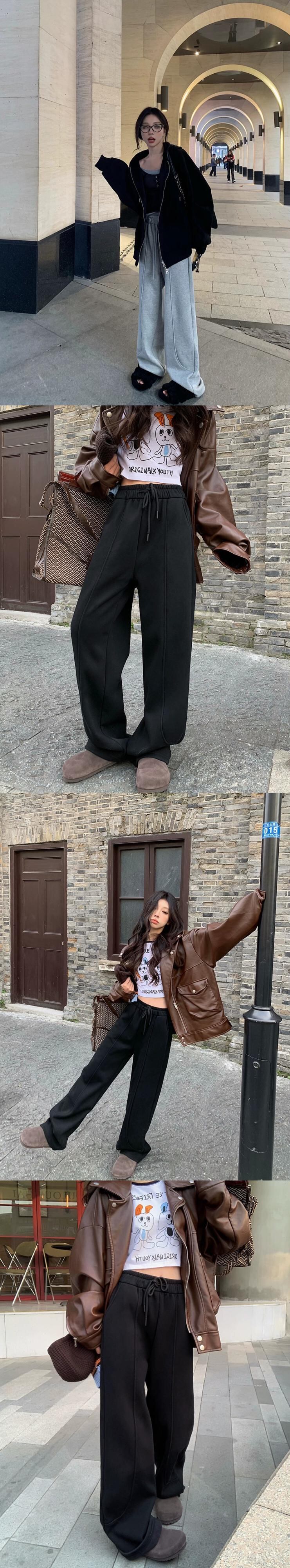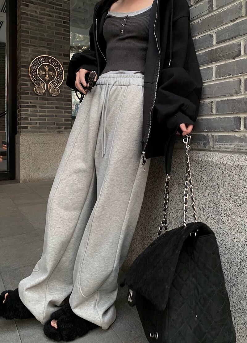 グレーのハイウエストドローストリングカジュアルパンツレディース、冬のベルベットの厚みのあるストレートパンツ、ルーズワイドレッグパンツ、スウェットパンツ、フロアレングスパンツ ウィンター 冬物 0921921201001220