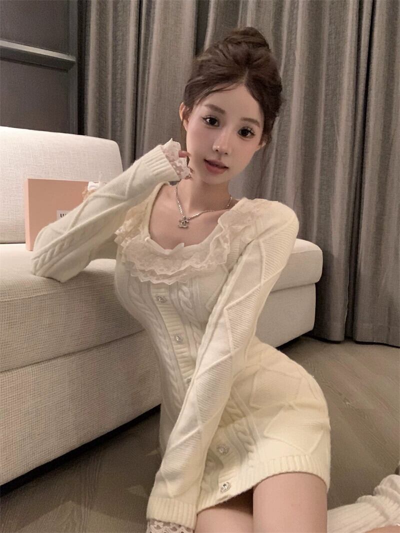 甘くて優しいレースニットドレスの女性の春 2024 新しいスタイル厚い重工業純粋な欲望底セータードレス 大人ガーリー スウィート キュート カジュアル スプリング 春物 ピュア 0921937887934703