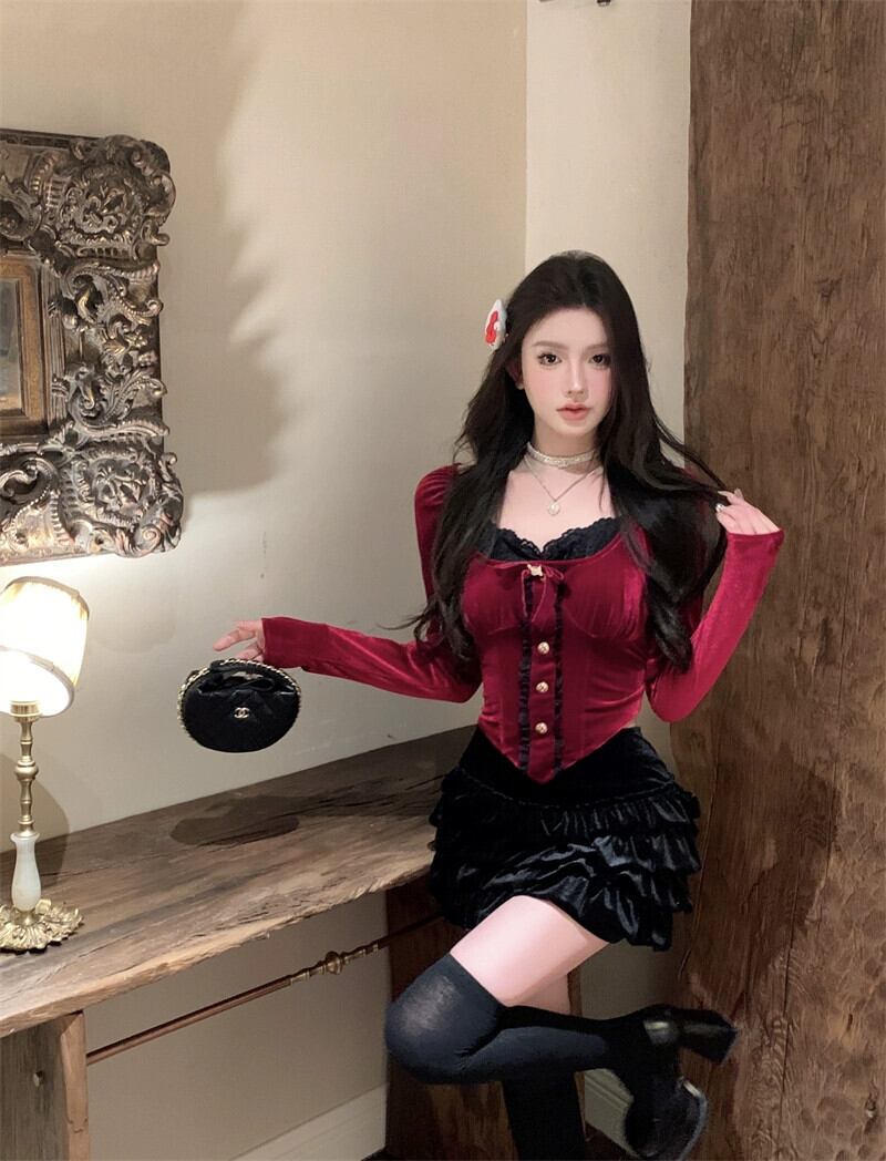 フランスのファッションスーツスカート女性春 2024 新しいベルベットレーストップ痩身ケーキスカート 2 点セット スプリング 春物 0921968048146485