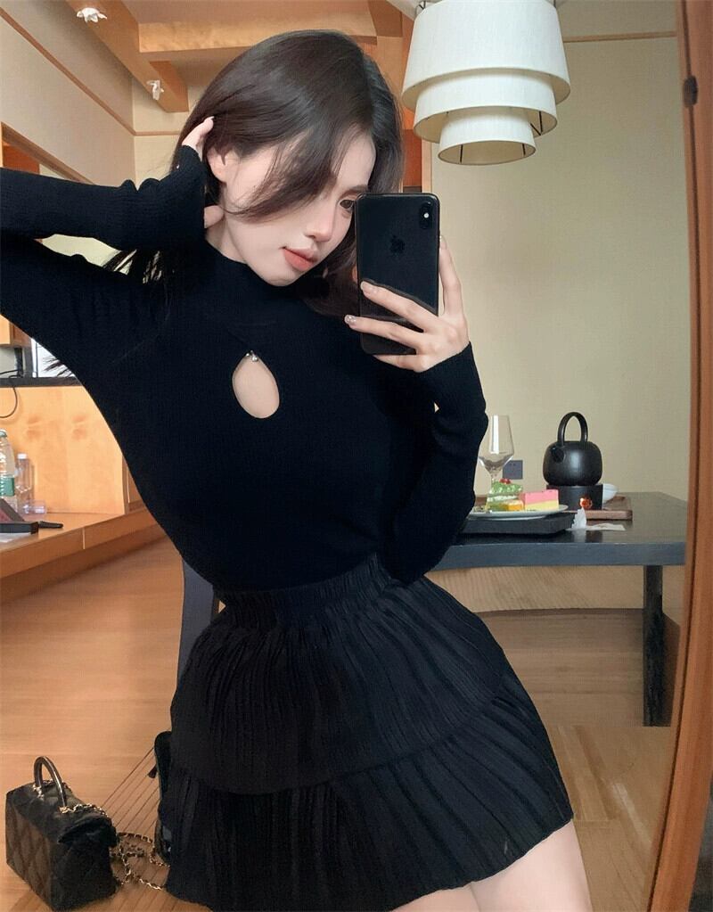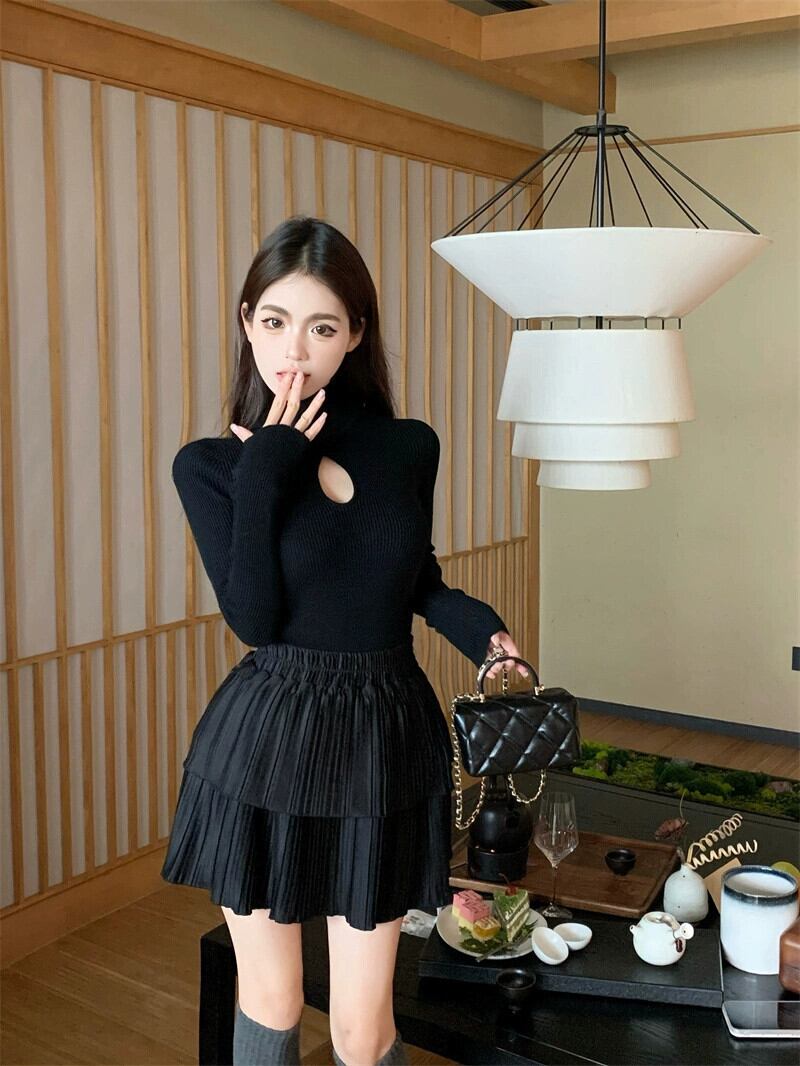 純粋な欲望ホットガールスーツスカート女性の秋と冬の襟長袖セーター黒パフスカートスリムスカート 2 点セット ロング ブラック オータム 秋物 ウィンター 冬物 0921910309270809
