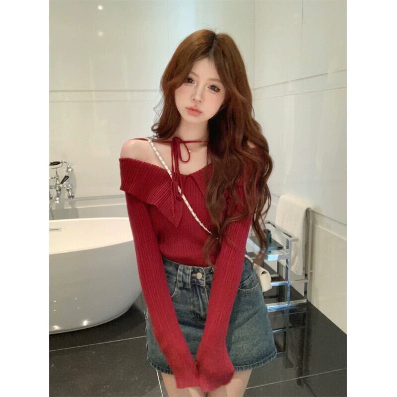クリスマスレッドワンショルダー長袖セーター女性 2024 春の新しい気質ショートスリムスリムトップトレンディ ロング スプリング 春物 0921948779717646
