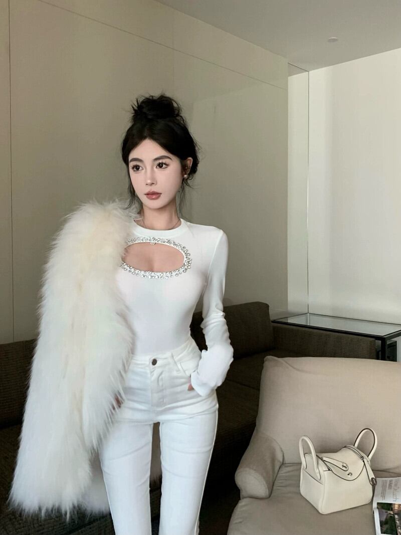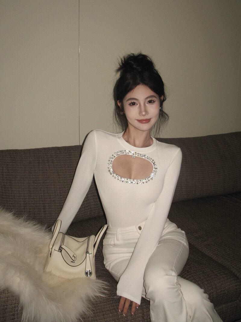 純粋な欲望ロイヤルシスター風シャツダイヤモンド中空長袖 Tシャツ女性春 2024 気質ショートスリムトップイン ロング スプリング 春物 0921991344103155