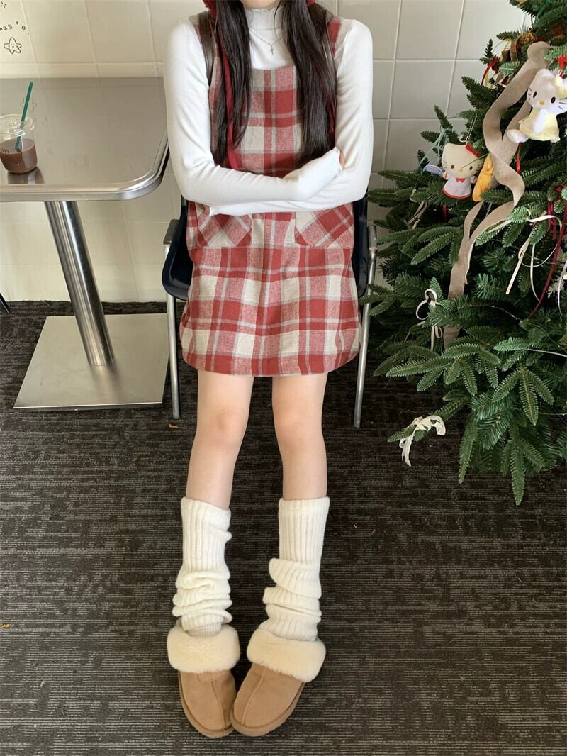 Sweetberry Hearts クリスマススタックウールチェック柄スカートベストドレス女性の冬起毛底シャツツーピーススーツ 大人ガーリー スウィート キュート カジュアル ウィンター 冬物 0921970074313626