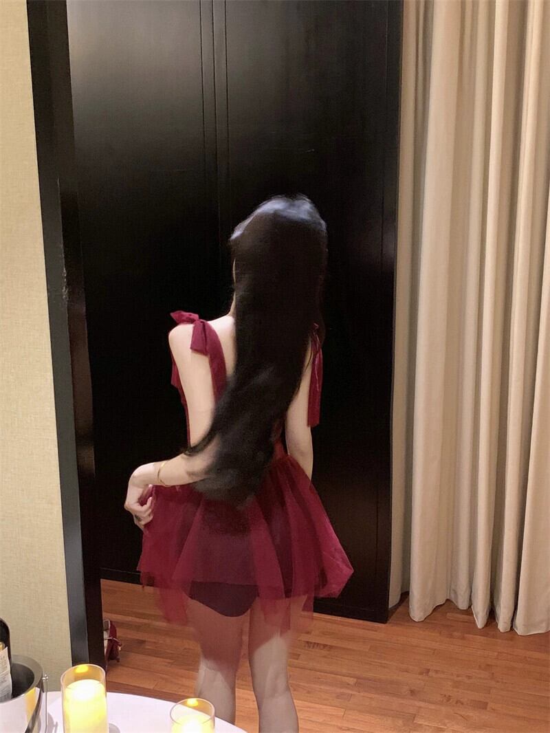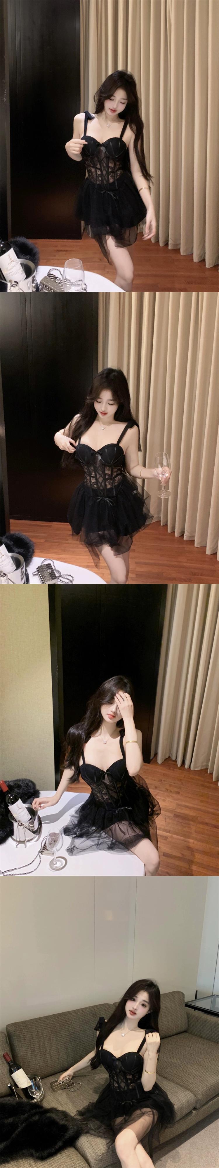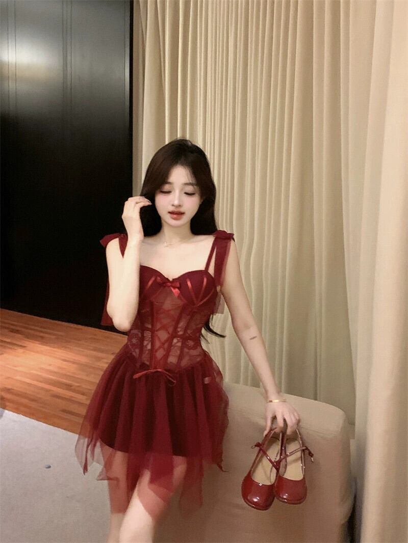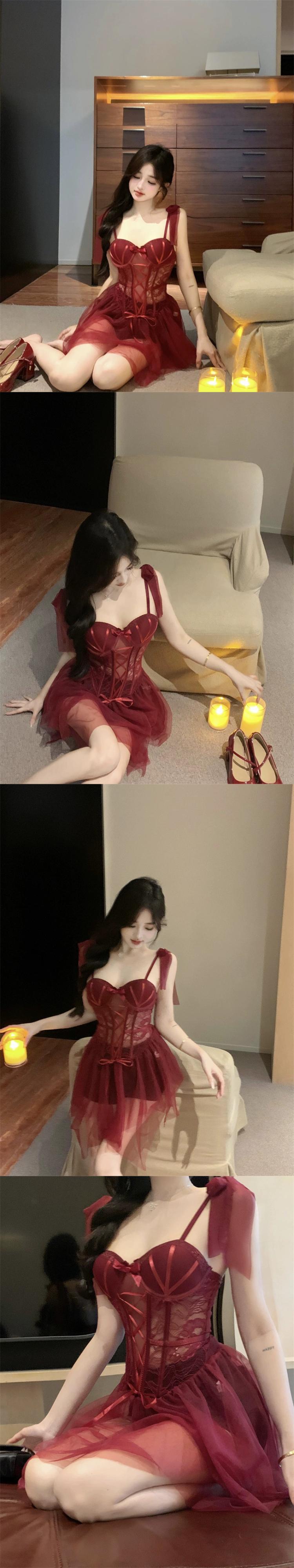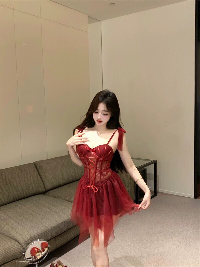 バーガンディレースサスペンダードレス女性、春デザイン、フィッシュボーンウエストスカート、セクシーなメッシュブラナイトガウン スプリング 春物 0921964015278678