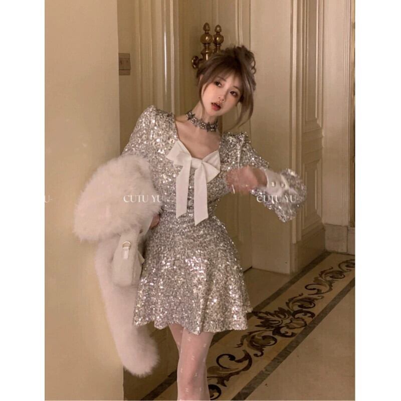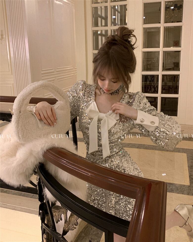 リボンスパンコールヘビー V ネックドレスレディース春ウエスト痩身ミニドレス長袖優しいショートスカート ロング スプリング 春物 Vネック 0921960407466421