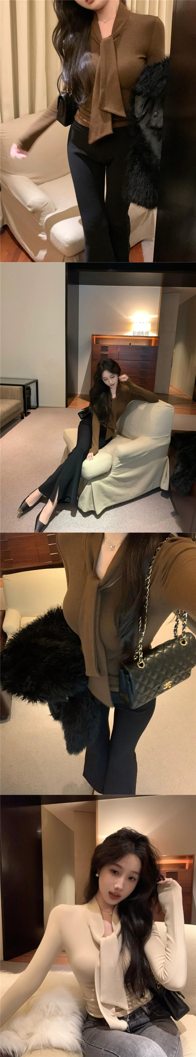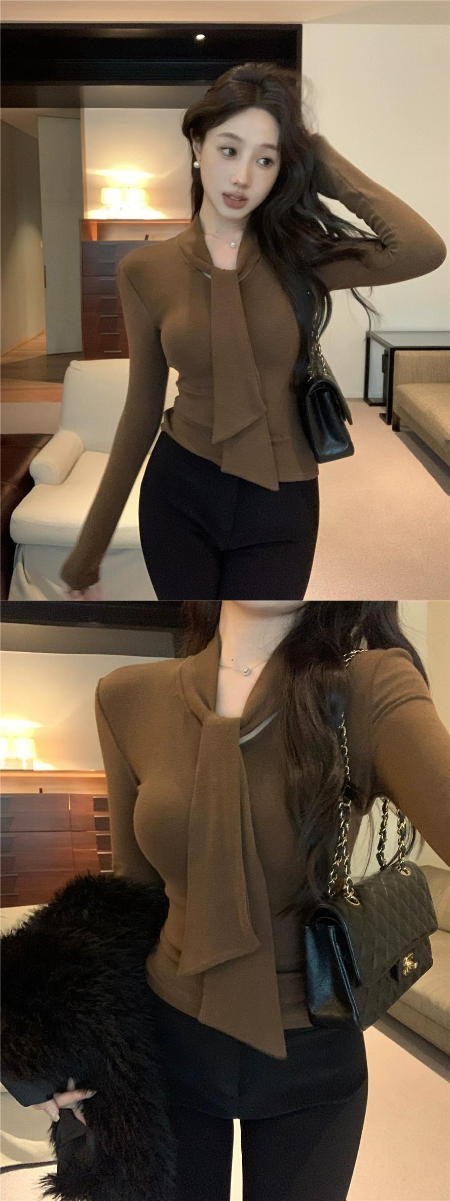 茶色のネクタイ、ブラッシュド プラス ベルベット ボトム シャツ、長袖 T シャツ レディース、春スリム フィット、シックでスイートなトップス ロング 大人ガーリー スウィート キュート カジュアル スプリング 春物 Tシャツ 0921928392614359