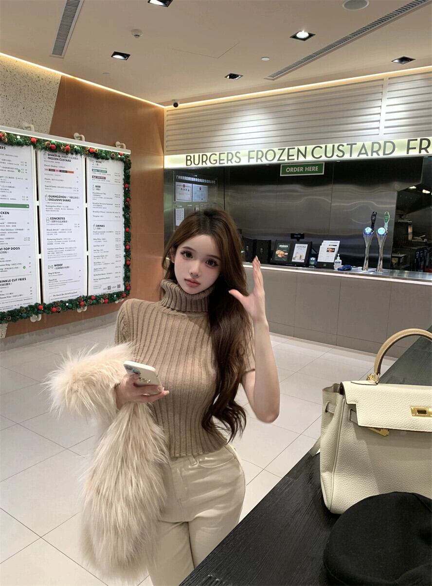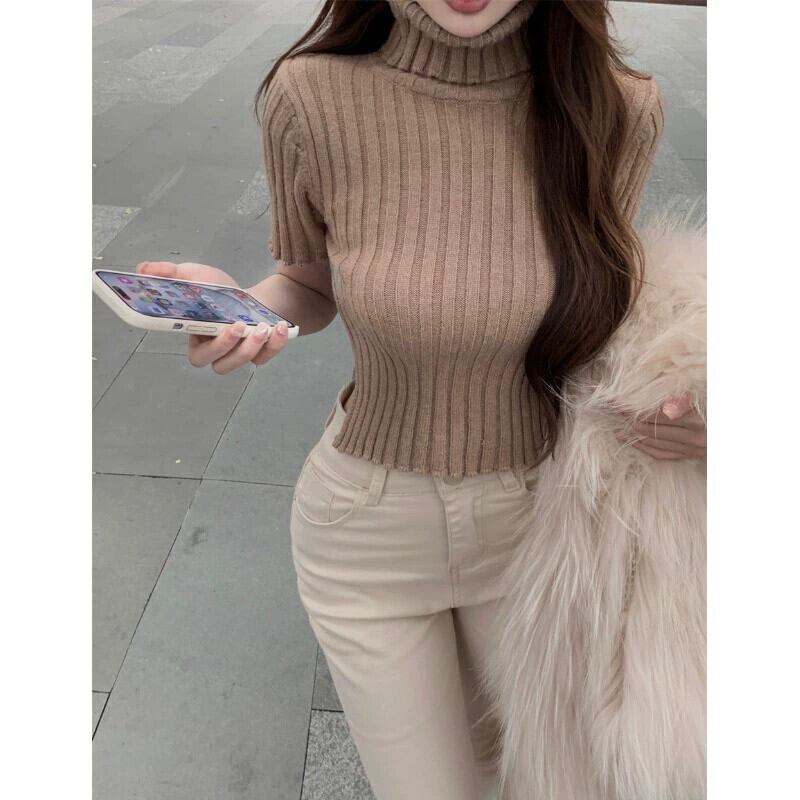デザインハイカラー半袖セーター女性春 2024 新しいスタイル気質ショートスリムスリムニットトップ スプリング 春物 0921997710286544