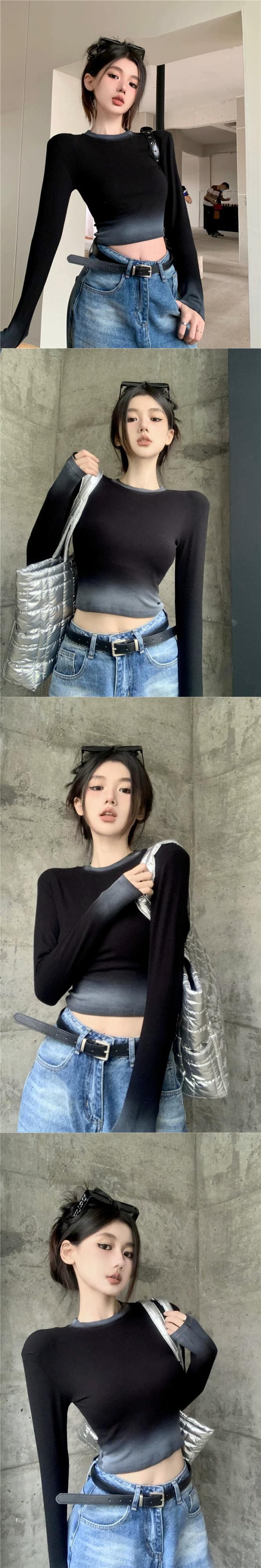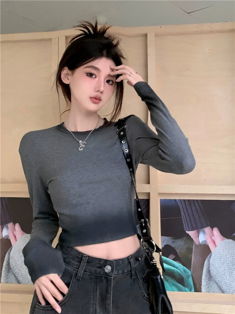 アメリカのラウンドネックプルオーバー長袖 Tシャツ女性春 2024 新しいスタイルの気質ショートスリムスリムトップイン ロング スプリング 春物 Oネック 0921923403627797