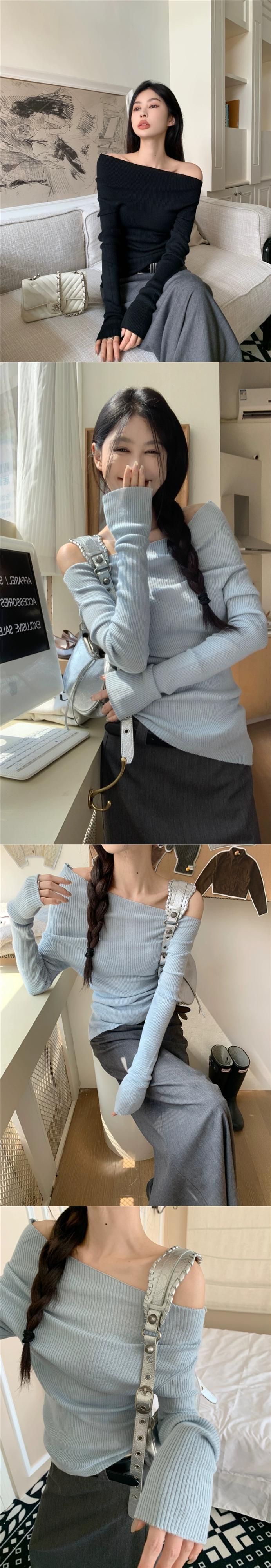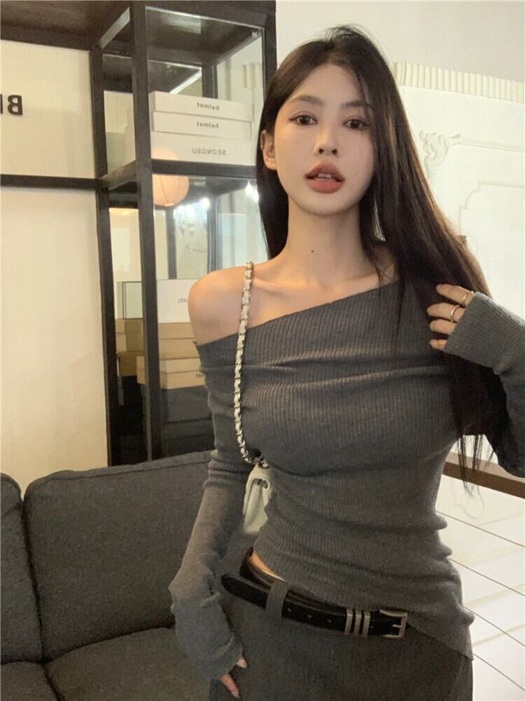 セクシーなワンショルダー長袖セーター女性春 2024 新しいスタイルの気質スリム痩身ボトシャツトップ ロング スプリング 春物 0921940143062882