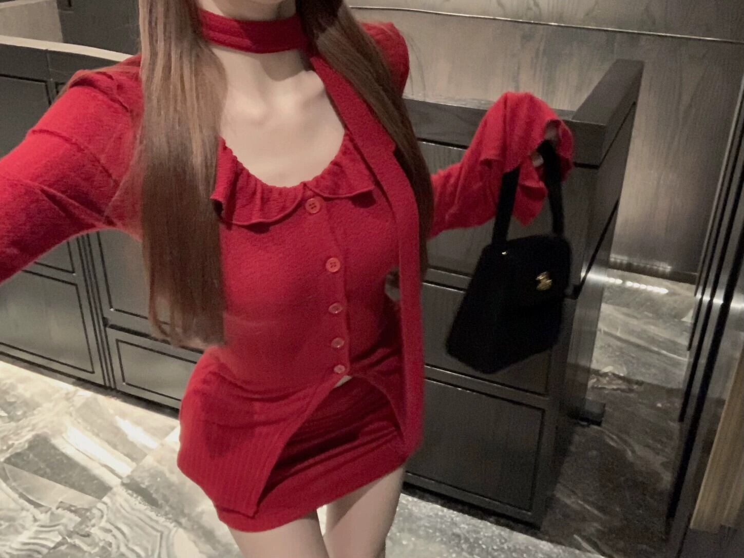 純粋な欲望スタイル赤スーツ女性春ホルターネックリボンセータートップヒップカバースカートショートスカート 2 点セット レッド スプリング 春物 0921974813794748