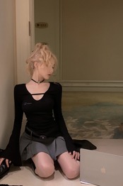 ブラックネクタイ中空 V ネックトランペットスリーブ Tシャツレディース 2024 春の新作スリムウエスト不規則なショートトップ スプリング 春物 Vネック 0921934650049467