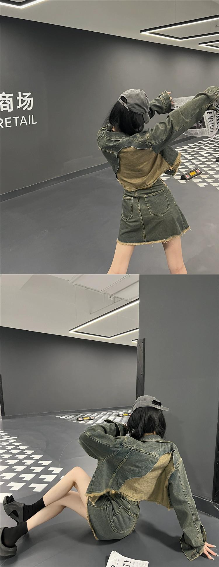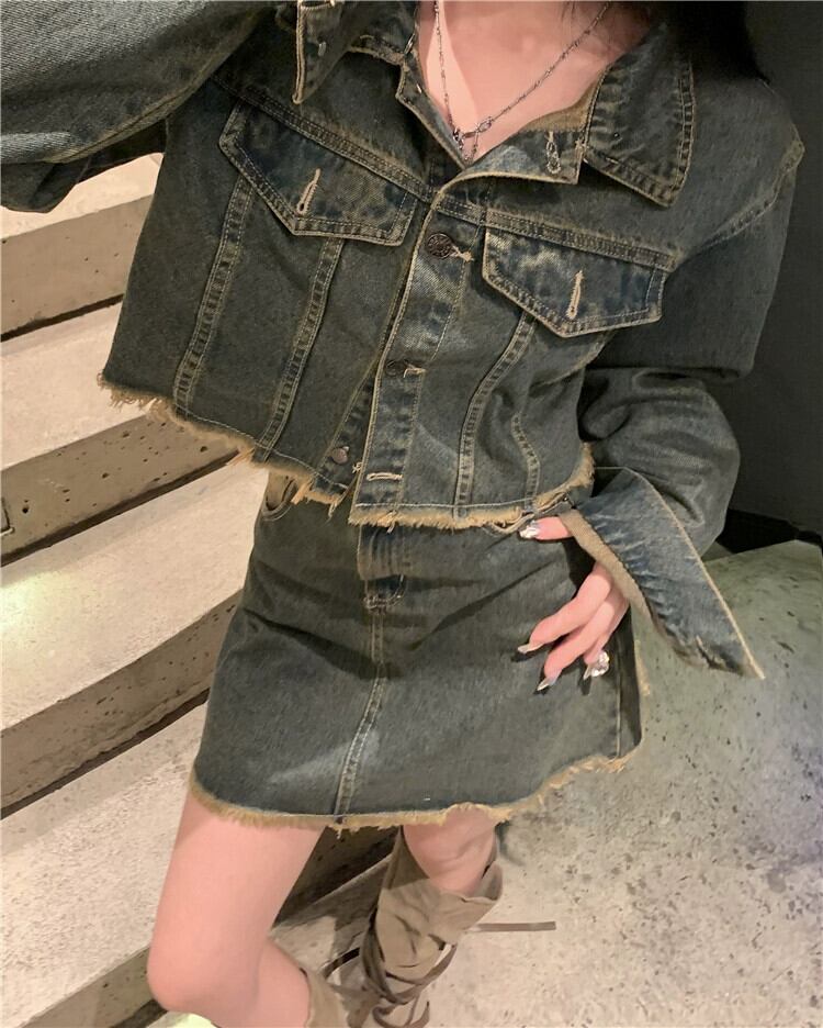 レトロな香港スタイルのデニムスーツの女性の春ポロカラーローエッジショートコートハイウエストヒップスカート 2 点セット ハイウェスト スプリング 春物 0921957224027345